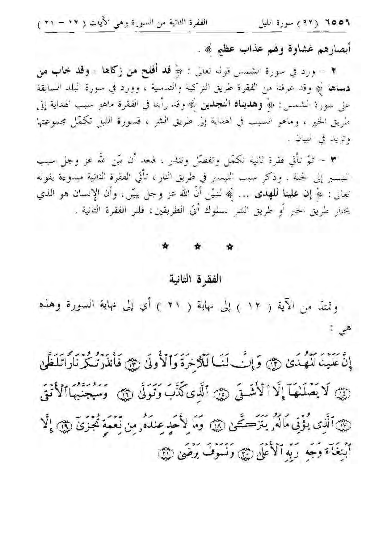 3 - ثم تأتي فقرة ثانية تكمل وتفصل وتنذر، فبعد أن بين الله عزّ وجل سبب التيسير إلى الجنة. وذكر سبب التيسير في طريق النار، تأتي الفقرة الثانية مبدوءة بقوله تعالى: إِنَّ عَلَيْنا لَلْهُدى ... لتبين أن الله عزّ وجل يبين، وأن الإنسان هو الذي يختار طريق الخير أو طريق الشر بسلوك أي الطريقين، فلنر الفقرة الثانية.