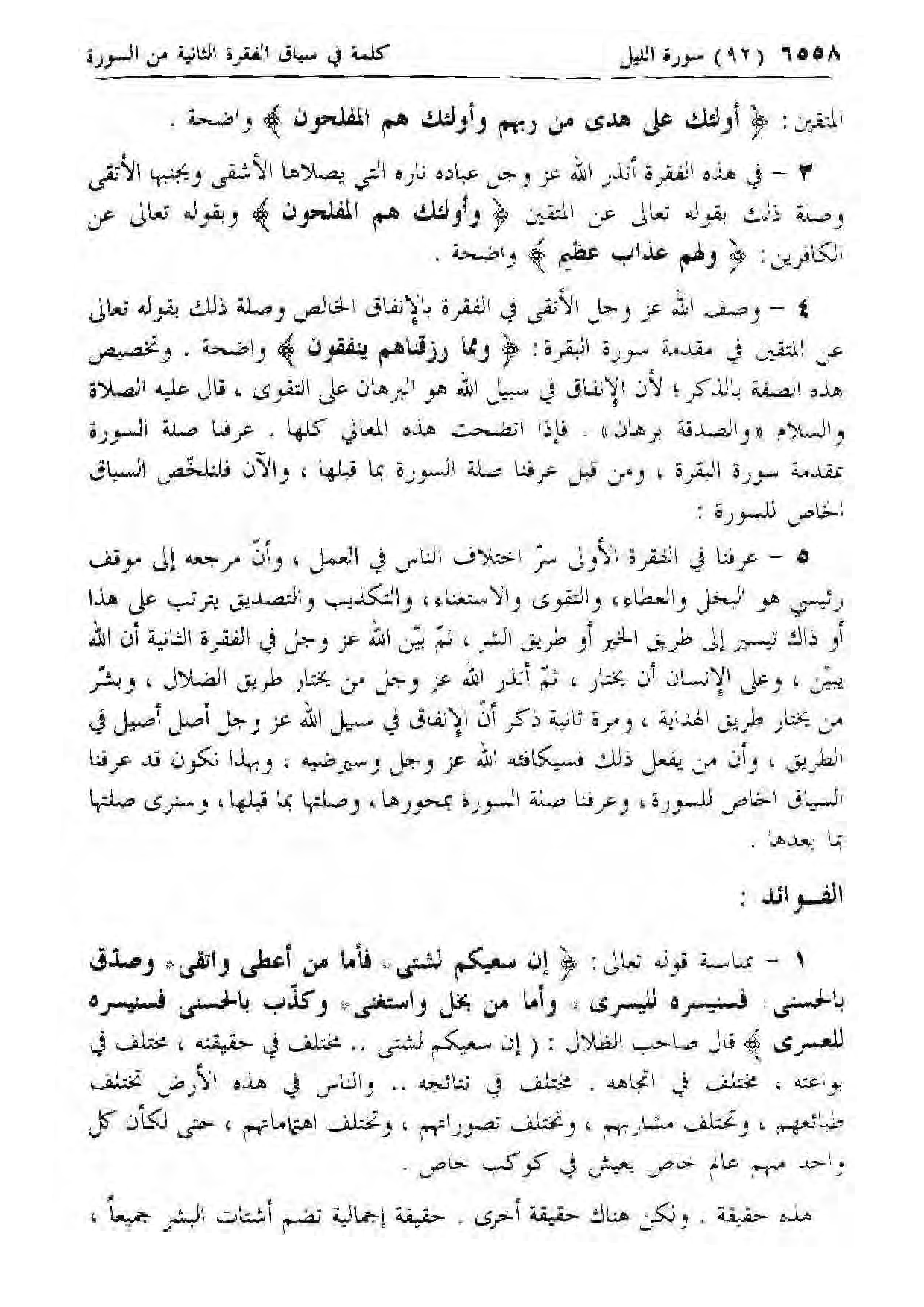 5 - عرفنا في الفقرة الأولى سر اختلاف الناس في العمل، وأن مرجعه إلى موقف رئيسي هو البخل والعطاء، والتقوى والاستغناء، والتكذيب والتصديق يترتب على هذا أو ذاك تيسير إلى طريق الخير أو طريق الشر، ثم بين الله عزّ وجل في الفقرة الثانية أن الله يبين، وعلى الإنسان أن يختار، ثم أنذر الله عزّ وجل من يختار طريق