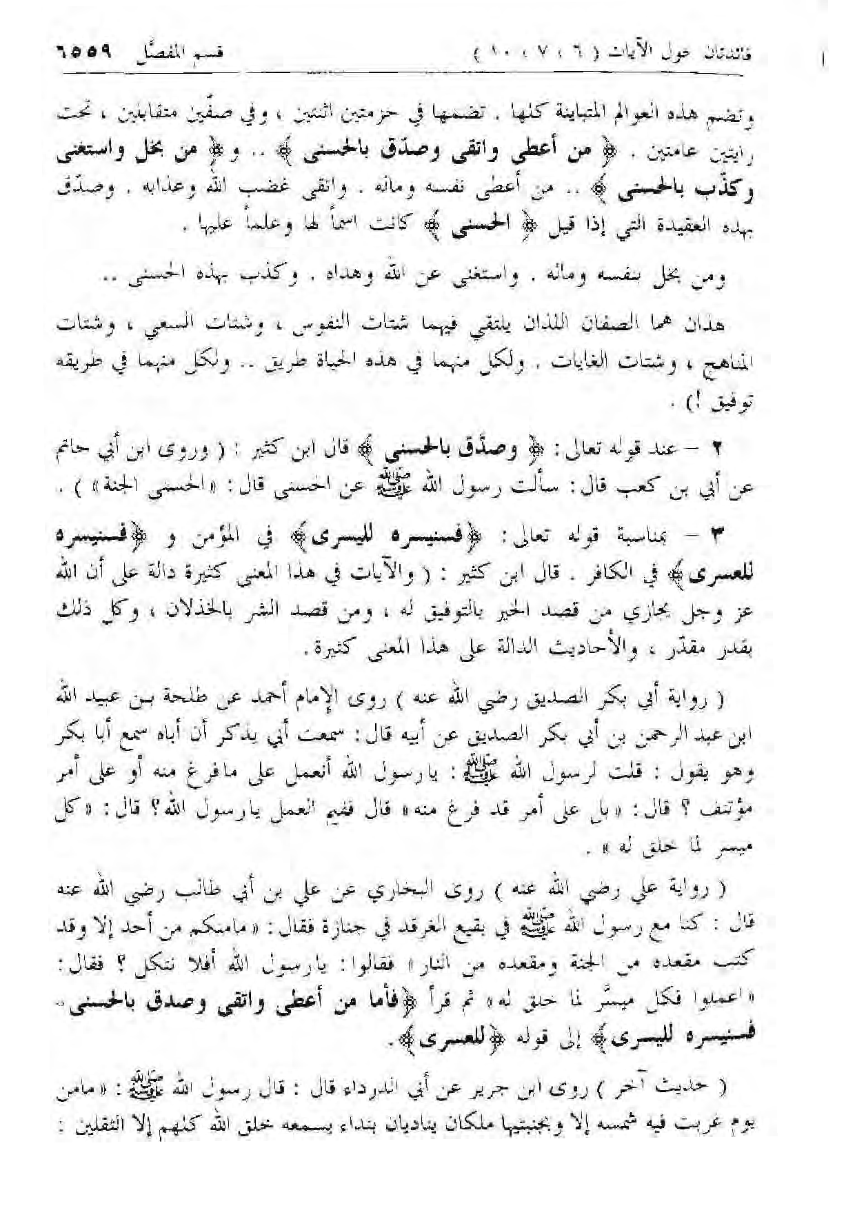 3 - بمناسبة قوله تعالى: فَسَنُيَسِّرُهُ لِلْيُسْرى في المؤمن وفَسَنُيَسِّرُهُ لِلْعُسْرى في الكافر. قال ابن كثير: (والآيات في هذا المعنى كثيرة دالة على أن الله عزّ وجل يجازي من قصد الخير بالتوفيق له، ومن قصد الشر بالخذلان، وكل ذلك بقدر مقدر، والأحاديث الدالة على هذا المعنى كثيرة.