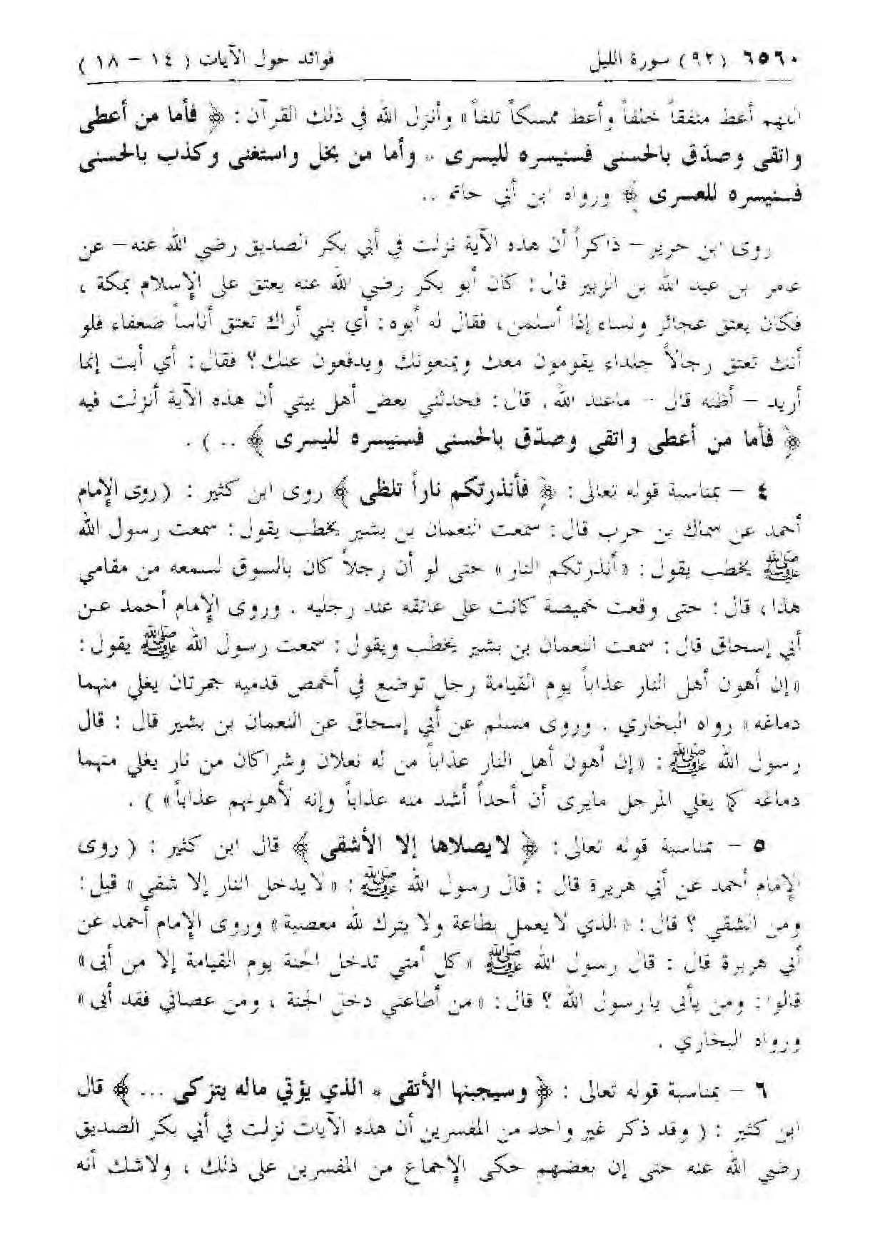 6 - بمناسبة قوله تعالى: وَسَيُجَنَّبُهَا الْأَتْقَى* الَّذِي يُؤْتِي مالَهُ يَتَزَكَّى ... قال ابن كثير: (وقد ذكر غير واحد من المفسرين أن هذه الآيات نزلت في أبي بكر الصديق رضي