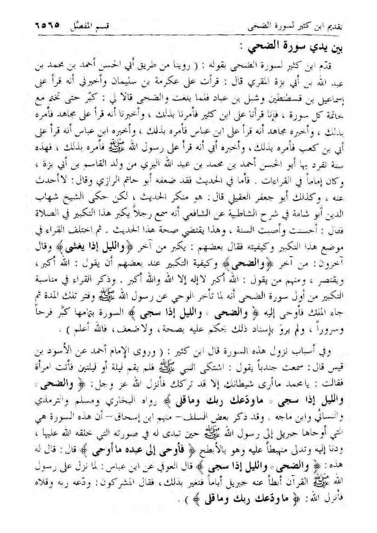 قدم ابن كثير لسورة الضحى بقوله: (روينا من طريق أبي الحسن أحمد بن محمد بن عبد الله بن أبي بزة المقري قال: قرأت على عكرمة بن سليمان وأخبرني أنه قرأ على إسماعيل بن قسطنطين وشبل بن عباد فلما بلغت والضحى قالا لي: كبر حتى تختم مع خاتمة كل سورة، فإنا قرأنا على ابن كثير فأمرنا بذلك، وأخبرنا أنه قرأ على مجاهد فأمره بذلك، وأخبره مجاهد أنه قرأ على ابن عباس فأمره بذلك، وأخبره ابن عباس أنه قرأ على أبي بن كعب فأمره بذلك، وأخبره أبي أنه قرأ على رسول الله صلى الله عليه وسلم فأمره بذلك، فهذه سنة تفرد بها أبو الحسن أحمد بن محمد بن عبد الله البزي من ولد القاسم بن أبي بزة، وكان إماما في القراءات. فأما في الحديث فقد ضعفه أبو حاتم الرازي وقال: لا أحدث عنه، وكذلك أبو جعفر العقيلي قال: هو منكر الحديث، لكن حكى الشيخ شهاب الدين أبو شامة في شرح الشاطبية عن الشافعي أنه سمع رجلا يكبر هذا التكبير في الصلاة فقال: أحسنت وأصبت السنة، وهذا يقتضي صحة هذا الحديث. ثم اختلف القراء في موضع هذا التكبير وكيفيته فقال بعضهم: يكبر من آخر وَاللَّيْلِ إِذا يَغْشى وقال آخرون: من آخر وَالضُّحى وكيفية التكبير عند بعضهم أن يقول: الله أكبر، ويقتصر، ومنهم من يقول: الله أكبر لا إله إلا الله والله أكبر. وذكر القراء في مناسبة التكبير من أول سورة الضحى أنه لما تأخر الوحي عن رسول الله صلى الله عليه وسلم وفتر تلك المدة ثم جاء الملك فأوحى إليه وَالضُّحى * وَاللَّيْلِ إِذا سَجى السورة بتمامها كبر فرحا وسرورا، ولم يرو بإسناد ذلك يحكم عليه بصحة، ولا ضعف، فالله أعلم).