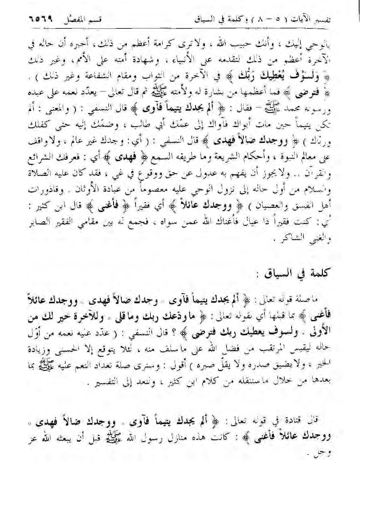 ما صلة قوله تعالى: أَلَمْ يَجِدْكَ يَتِيماً فَآوى * وَوَجَدَكَ ضَالًّا فَهَدى * وَوَجَدَكَ عائِلًا فَأَغْنى بما قبلها أي بقوله تعالى: ما وَدَّعَكَ رَبُّكَ وَما قَلى * وَلَلْآخِرَةُ خَيْرٌ لَكَ مِنَ الْأُولى * وَلَسَوْفَ يُعْطِيكَ رَبُّكَ فَتَرْضى؟ قال النسفي: (عدد عليه نعمه من أول حاله ليقيس المرتقب من فضل الله على ما سلف منه، لئلا يتوقع إلا الحسنى وزيادة الخير، ولا يضيق صدره ولا يقل صبره) أقول: وسنرى صلة تعداد النعم عليه صلى الله عليه وسلم بما بعدها من خلال ما سننقله من كلام ابن كثير، ولنعد إلى التفسير.
