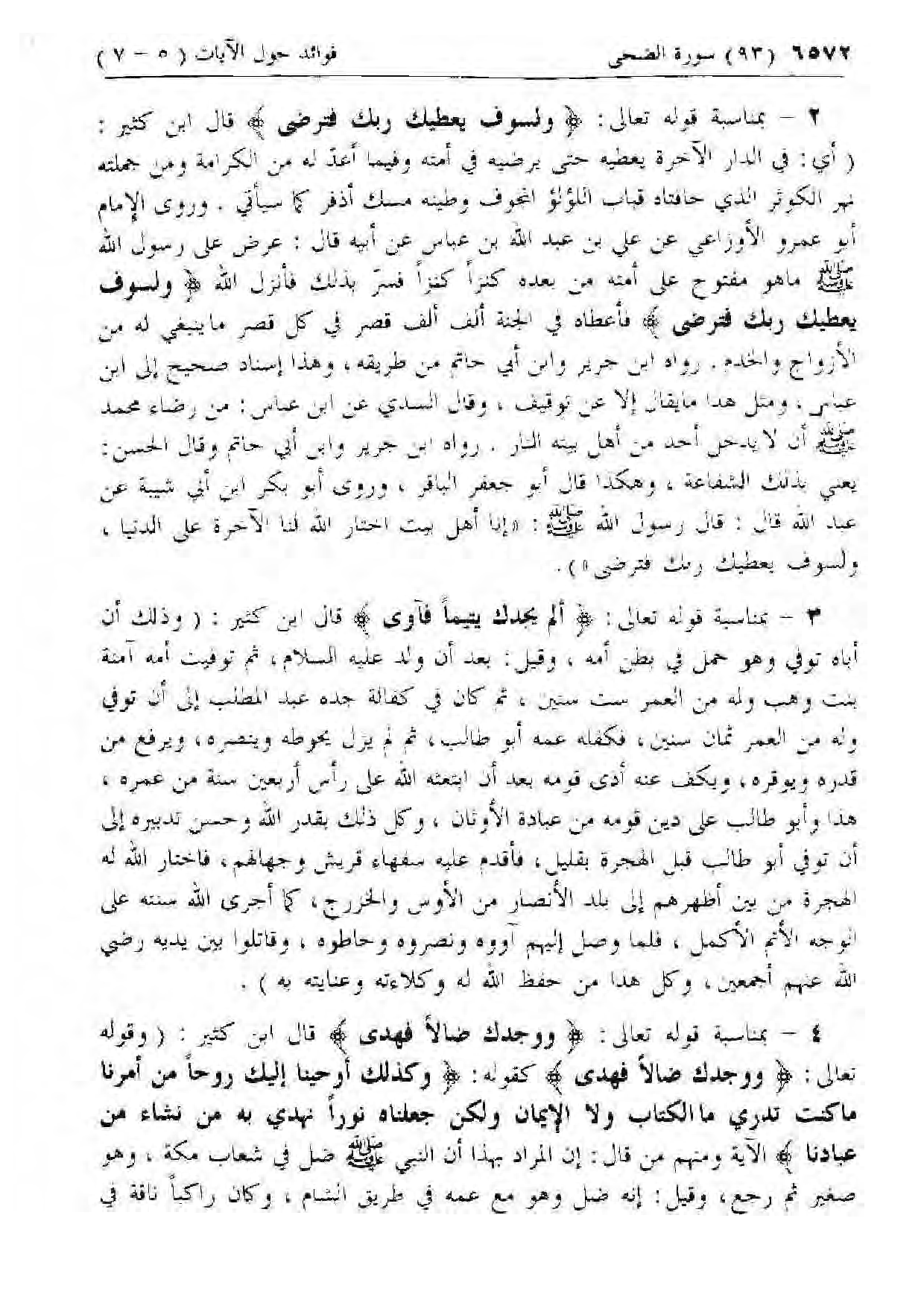 4 - بمناسبة قوله تعالى: وَوَجَدَكَ ضَالًّا فَهَدى قال ابن كثير: (وقوله تعالى: وَوَجَدَكَ ضَالًّا فَهَدى كقوله: وَكَذلِكَ أَوْحَيْنا إِلَيْكَ رُوحاً مِنْ أَمْرِنا ما كُنْتَ تَدْرِي مَا الْكِتابُ وَلَا الْإِيمانُ وَلكِنْ جَعَلْناهُ نُوراً نَهْدِي بِهِ مَنْ نَشاءُ مِنْ عِبادِنا الآية ومنهم من قال: إن المراد بهذا أن النبي صلى الله عليه وسلم ضل في شعاب مكة، وهو صغير ثم رجع، وقيل: إنه ضل وهو مع عمه في طريق الشام، وكان راكبا ناقة في