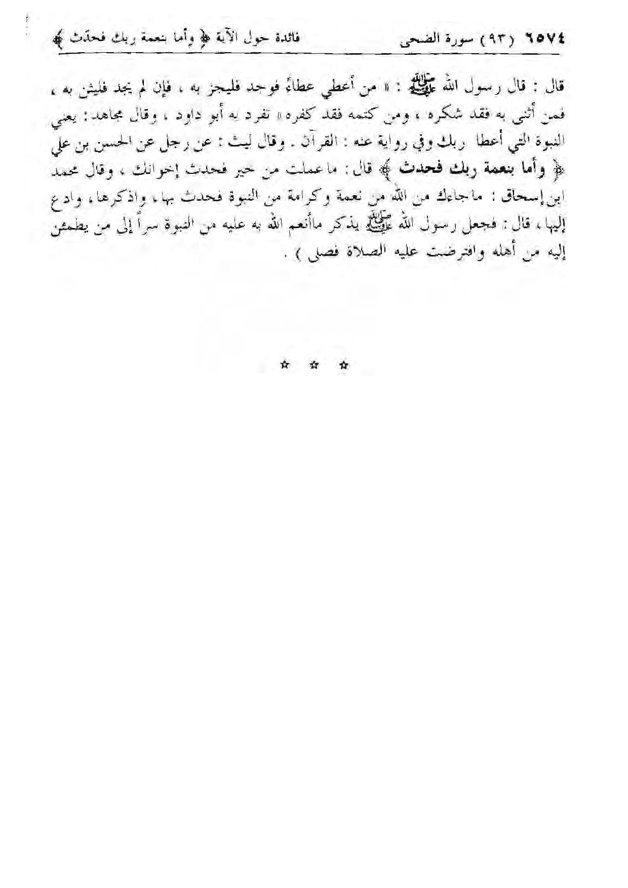 قال: قال رسول الله صلى الله عليه وسلم: «من أعطي عطاء فوجد فليجز به، فإن لم يجد فليثن به، فمن أثنى به فقد شكره، ومن كتمه فقد كفره» تفرد به أبو داود، وقال مجاهد: يعني النبوة التي أعطا ربك وفي رواية عنه: القرآن. وقال ليث: عن رجل عن الحسن بن علي وَأَمَّا بِنِعْمَةِ رَبِّكَ فَحَدِّثْ قال: ما عملت من خير فحدث إخوانك، وقال محمد ابن إسحاق: ما جاءك من الله من نعمة وكرامة من النبوة فحدث بها، واذكرها، وادع إليها، قال: فجعل رسول الله صلى الله عليه وسلم يذكر ما أنعم الله به عليه من النبوة سرا إلى من يطمئن إليه من أهله وافترضت عليه الصلاة فصلى).