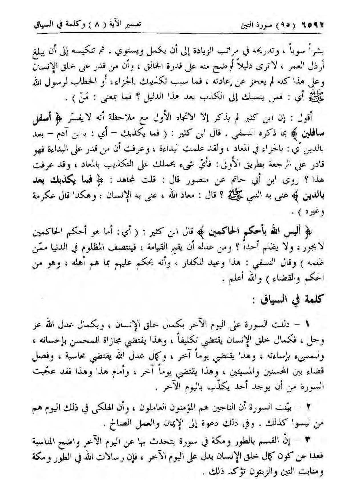 1 - دللت السورة على اليوم الآخر بكمال خلق الإنسان، وبكمال عدل الله عزّ وجل، فكمال خلق الإنسان يقتضي تكليفا، وهذا يقتضي مجازاة للمحسن بإحسانه، وللمسيئ بإساءته، وهذا يقتضي يوما آخر، وكمال عدل الله يقتضي محاسبة، وفصل قضاء بين المحسنين والمسيئين، وهذا يقتضي يوما آخر، وأمام هذا وهذا فقد عجبت السورة من أن يوجد أحد يكذب باليوم الآخر.