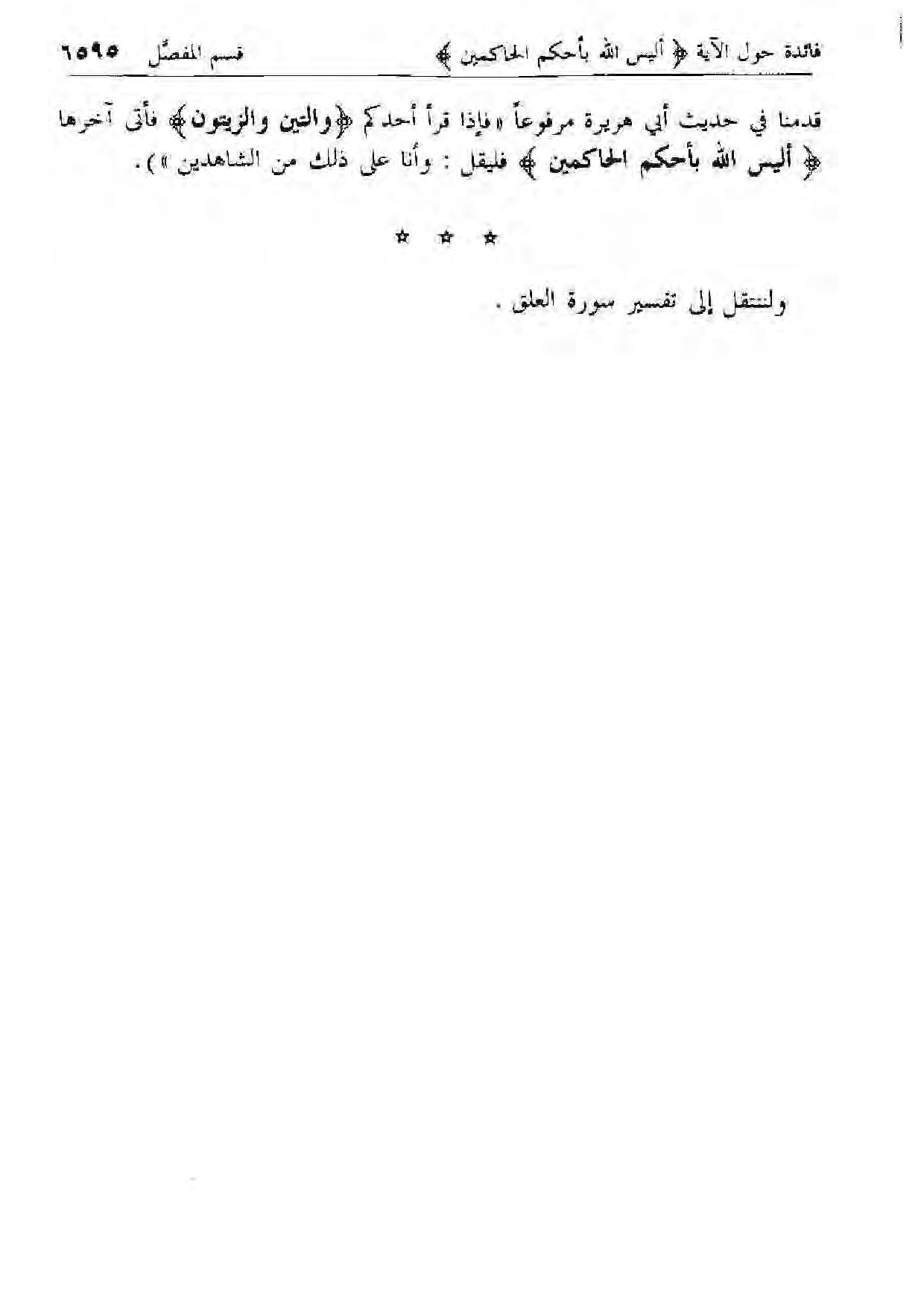 قدمنا في حديث أبي هريرة مرفوعا «فإذا قرأ أحدكم وَالتِّينِ وَالزَّيْتُونِ فأتى آخرها أَلَيْسَ اللَّهُ بِأَحْكَمِ الْحاكِمِينَ فليقل: وأنا على ذلك من الشاهدين»).