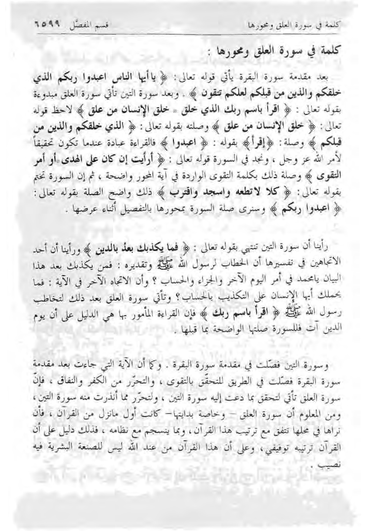 وسورة التين فصلت في مقدمة سورة البقرة. وكما أن الآية التي جاءت بعد مقدمة سورة البقرة فصلت في الطريق للتحقق بالتقوى، والتحرر من الكفر والنفاق، فإن سورة العلق تأتي لتحقق بما دعت إليه سورة التين، ولتحرر مما أنذرت منه سورة التين، ومن المعلوم أن سورة العلق- وخاصة بدايتها- كانت أول ما نزل من القرآن، فإن نراها في محلها تتفق مع ترتيب هذا القرآن، وبما ينسجم مع نظامه، فذلك دليل على أن القرآن ترتيبه توقيفي، وعلى أن هذا القرآن من عند الله ليس للصنعة البشرية فيه نصيب.
