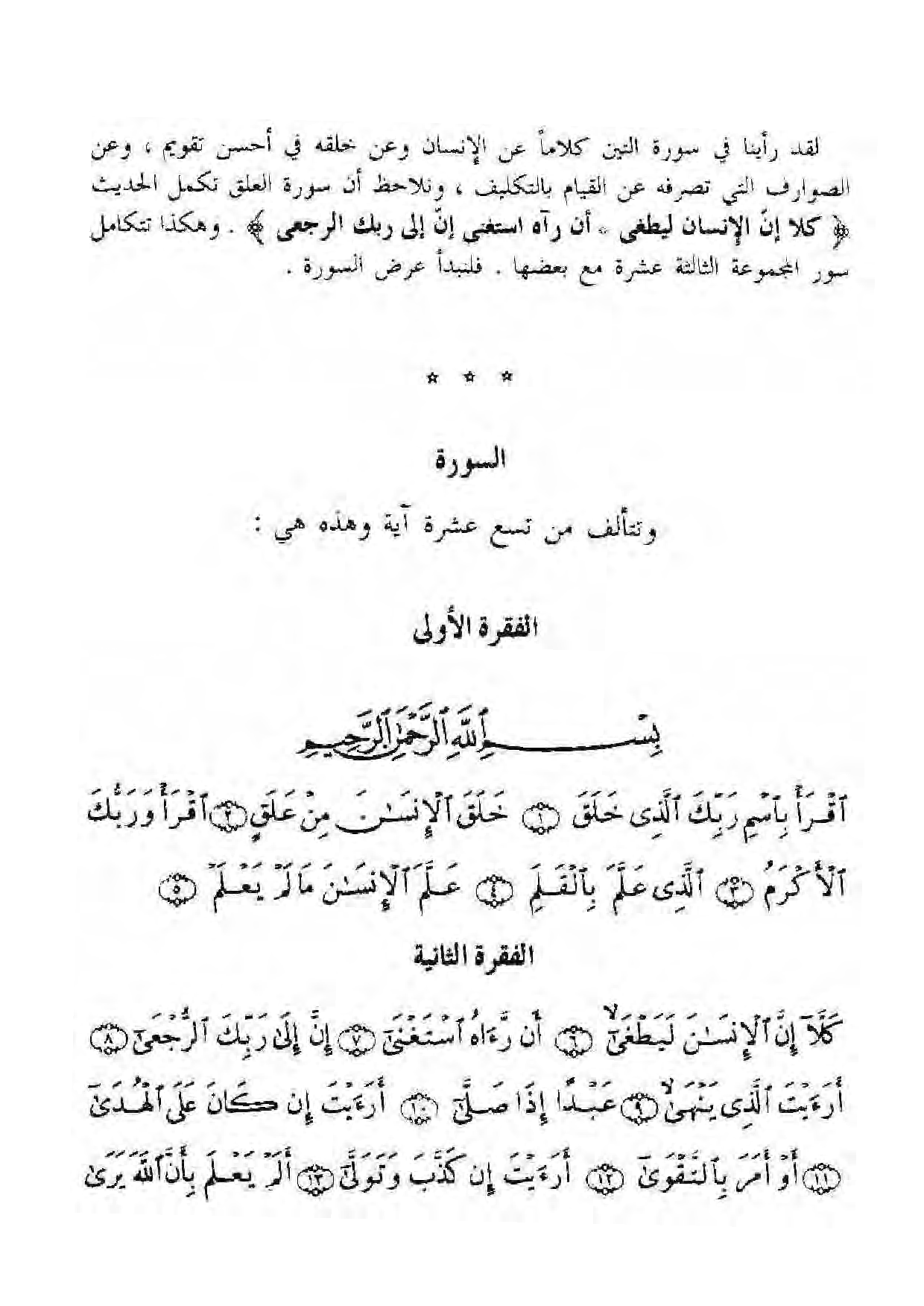 لقد رأينا في سورة التين كلاما عن الإنسان وعن خلقه في أحسن تقويم، وعن الصوارف التي تصرفه عن القيام بالتكليف، ونلاحظ أن سورة العلق تكمل الحديث كَلَّا إِنَّ الْإِنْسانَ لَيَطْغى * أَنْ رَآهُ اسْتَغْنى إِنَّ إِلى رَبِّكَ الرُّجْعى. وهكذا تتكامل سور المجموعة الثالثة عشرة مع بعضها. فلنبدأ عرض السورة.