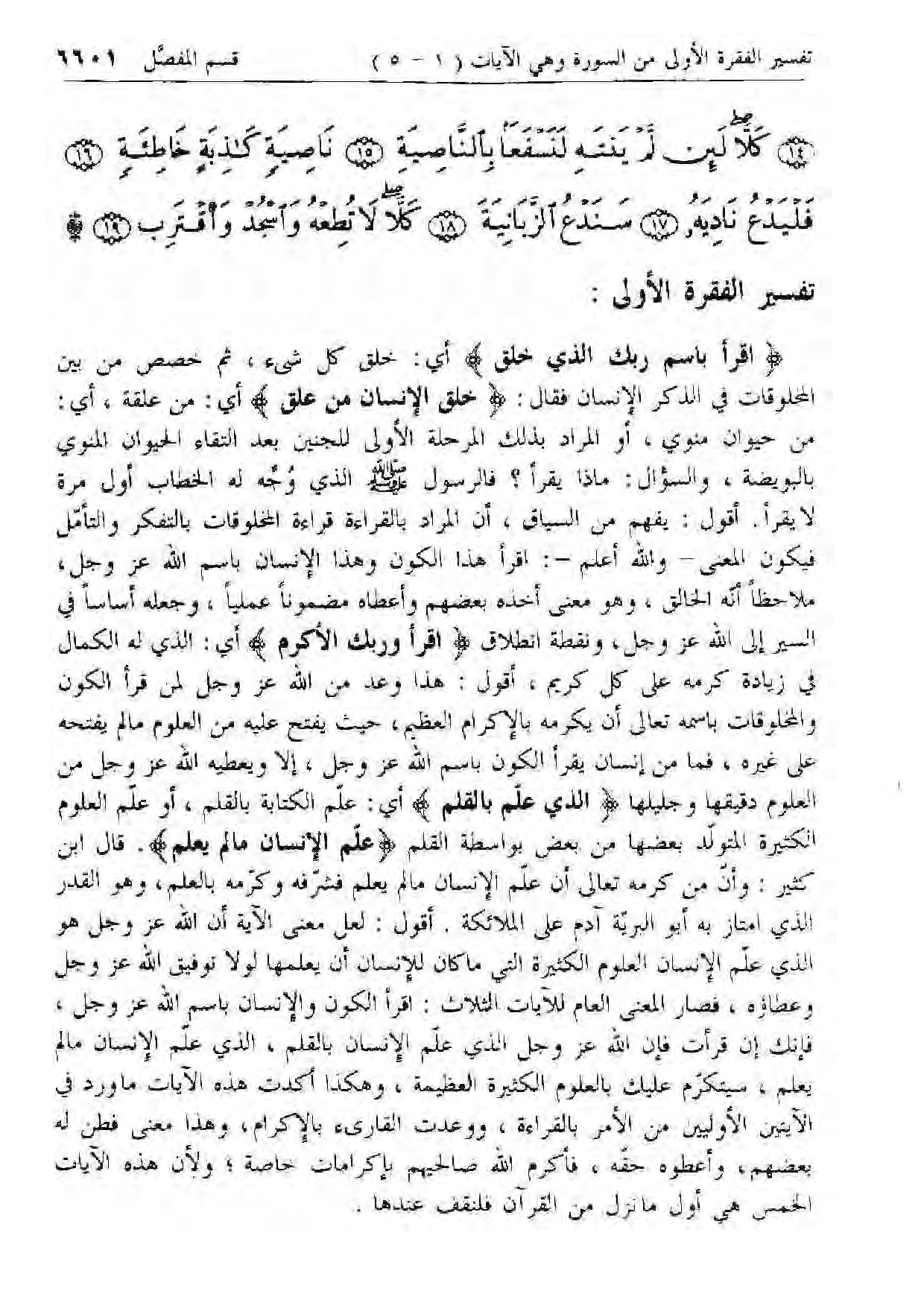 من حيوان منوي، أو المراد بذلك المرحلة الأولى للجنين بعد التقاء الحيوان المنوي بالبويضة، والسؤال: ماذا يقرأ؟ فالرسول صلى الله عليه وسلم الذي وجه له الخطاب أول مرة لا يقرأ. أقول: يفهم من السياق، أن المراد بالقراءة قراءة المخلوقات بالتفكر والتأمل فيكون المعنى- والله أعلم-: اقرأ هذا الكون وهذا الإنسان باسم الله عزّ وجل، ملاحظا أنه الخالق، وهو معنى أخذه بعضهم وأعطاه مضمونا عمليا، وجعله أساسا في السير إلى الله عزّ وجل، ونقطة انطلاق