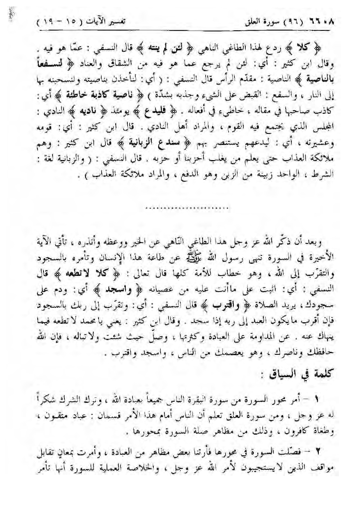 وبعد أن ذكر الله عزّ وجل هذا الطاغي الناهي عن الخير ووعظه وأنذره، تأتي الآية الأخيرة في السورة تنهى رسول الله صلى الله عليه وسلم عن طاعة هذا الإنسان وتأمره بالسجود والتقرب إلى الله، وهو خطاب للأمة كلها قال تعالى: كَلَّا لا تُطِعْهُ قال النسفي: أي: اثبت على ما أنت عليه من عصيانه وَاسْجُدْ أي: ودم على سجودك، يريد الصلاة وَاقْتَرِبْ قال النسفي: أي: وتقرب إلى ربك بالسجود فإن أقرب ما يكون العبد إلى ربه إذا سجد. وقال ابن كثير: يعني يا محمد لا تطعه فيما ينهاك عنه. عن المداومة على العبادة وكثرتها، وصل حيث شئت ولا تباله، فإن الله حافظك وناصرك، وهو يعصمك من الناس، واسجد واقترب.