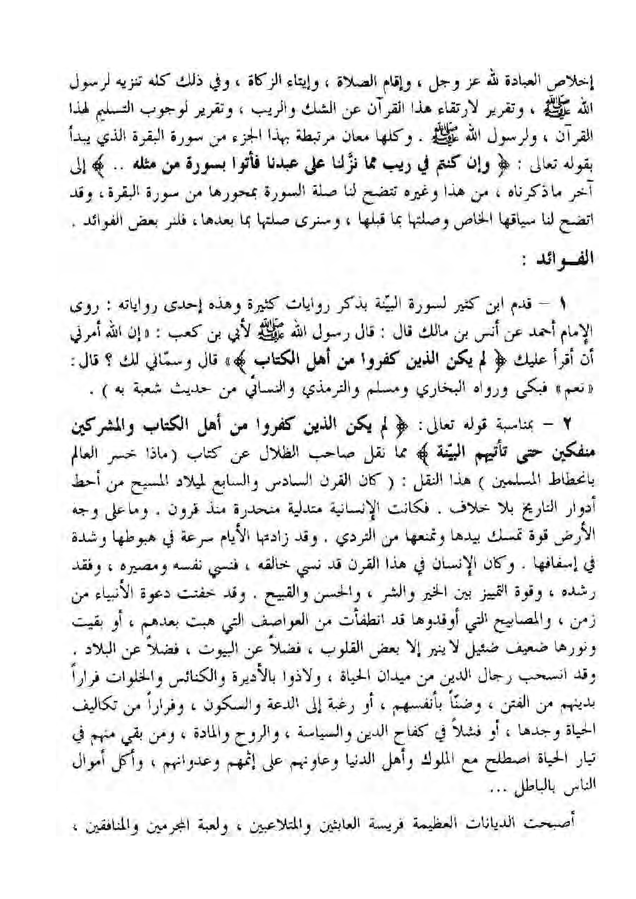 2 - بمناسبة قوله تعالى: لَمْ يَكُنِ الَّذِينَ كَفَرُوا مِنْ أَهْلِ الْكِتابِ وَالْمُشْرِكِينَ مُنْفَكِّينَ حَتَّى تَأْتِيَهُمُ الْبَيِّنَةُ مما نقل صاحب الظلال عن كتاب (ماذا خسر العالم بانحطاط المسلمين) هذا النقل: (كان القرن السادس والسابع لميلاد المسيح من أحط أدوار التاريخ بلا خلاف. فكانت الإنسانية متدلية منحدرة منذ قرون. وما على وجه الأرض قوة تمسك بيدها وتمنعها من التردي. وقد زادتها الأيام سرعة في هبوطها وشدة في إسفافها. وكان الإنسان في هذا القرن قد نسي خالقه، فنسي نفسه ومصيره، وفقد رشده، وقوة التمييز بين الخير والشر، والحسن والقبيح. وقد خفتت دعوة الأنبياء من زمن، والمصابيح التي أوقدوها قد انطفأت من العواصف التي هبت بعدهم، أو بقيت ونورها ضعيف ضئيل لا ينير إلا بعض القلوب، فضلا عن البيوت، فضلا عن البلاد.