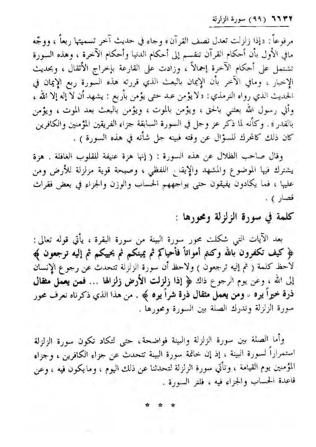 كَيْفَ تَكْفُرُونَ بِاللَّهِ وَكُنْتُمْ أَمْواتاً فَأَحْياكُمْ ثُمَّ يُمِيتُكُمْ ثُمَّ يُحْيِيكُمْ ثُمَّ إِلَيْهِ تُرْجَعُونَ لاحظ كلمة (ثم إليه ترجعون) ولاحظ أن سورة الزلزلة تتحدث عن رجوع الإنسان إلى الله، وعن يوم الرجوع ذاك إِذا زُلْزِلَتِ الْأَرْضُ زِلْزالَها ... فَمَنْ يَعْمَلْ مِثْقالَ ذَرَّةٍ خَيْراً يَرَهُ* وَمَنْ يَعْمَلْ مِثْقالَ ذَرَّةٍ شَرًّا يَرَهُ. من هذا الذي ذكرناه نعرف محور سورة الزلزلة وندرك الصلة بين السورة ومحورها.