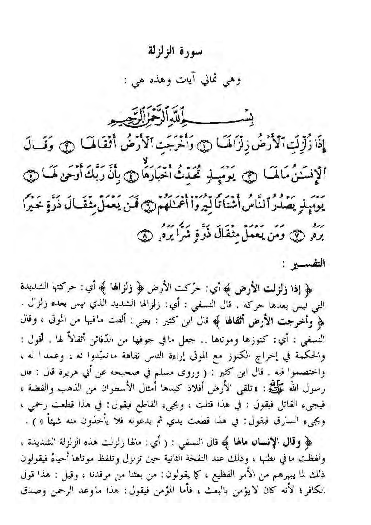 إِذا زُلْزِلَتِ الْأَرْضُ أي: حركت الأرض زِلْزالَها أي: حركتها الشديدة التي ليس بعدها حركة. قال النسفي: أي: زلزالها الشديد الذي ليس بعده زلزال.