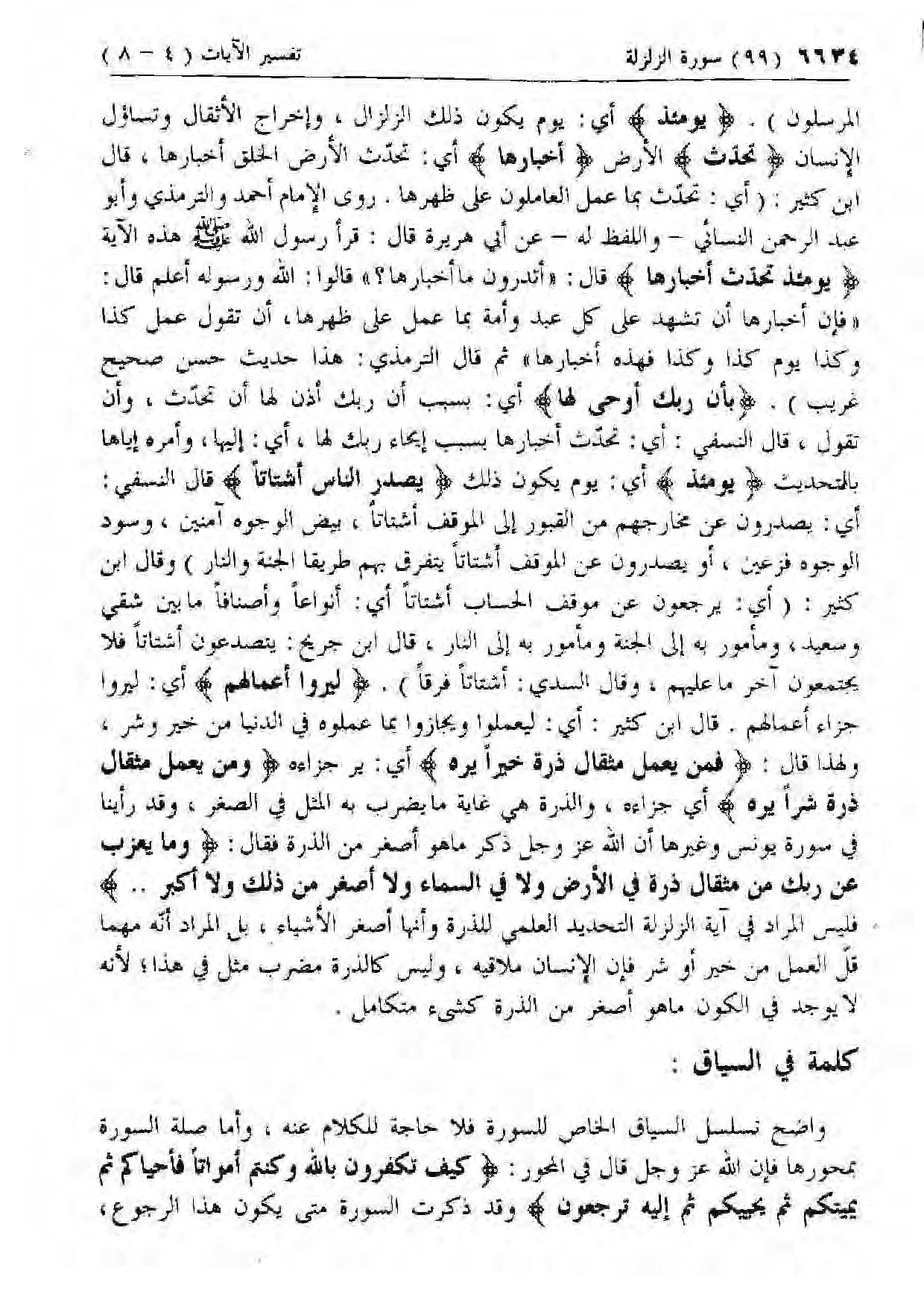 وَمَنْ يَعْمَلْ مِثْقالَ ذَرَّةٍ شَرًّا يَرَهُ أي جزاءه، والذرة هي غاية ما يضرب به المثل في الصغر، وقد رأينا في سورة يونس وغيرها أن الله عزّ وجل ذكر ما هو أصغر من الذرة فقال: وَما يَعْزُبُ عَنْ رَبِّكَ مِنْ مِثْقالِ ذَرَّةٍ فِي الْأَرْضِ وَلا فِي السَّماءِ وَلا أَصْغَرَ مِنْ ذلِكَ وَلا أَكْبَرَ ..
