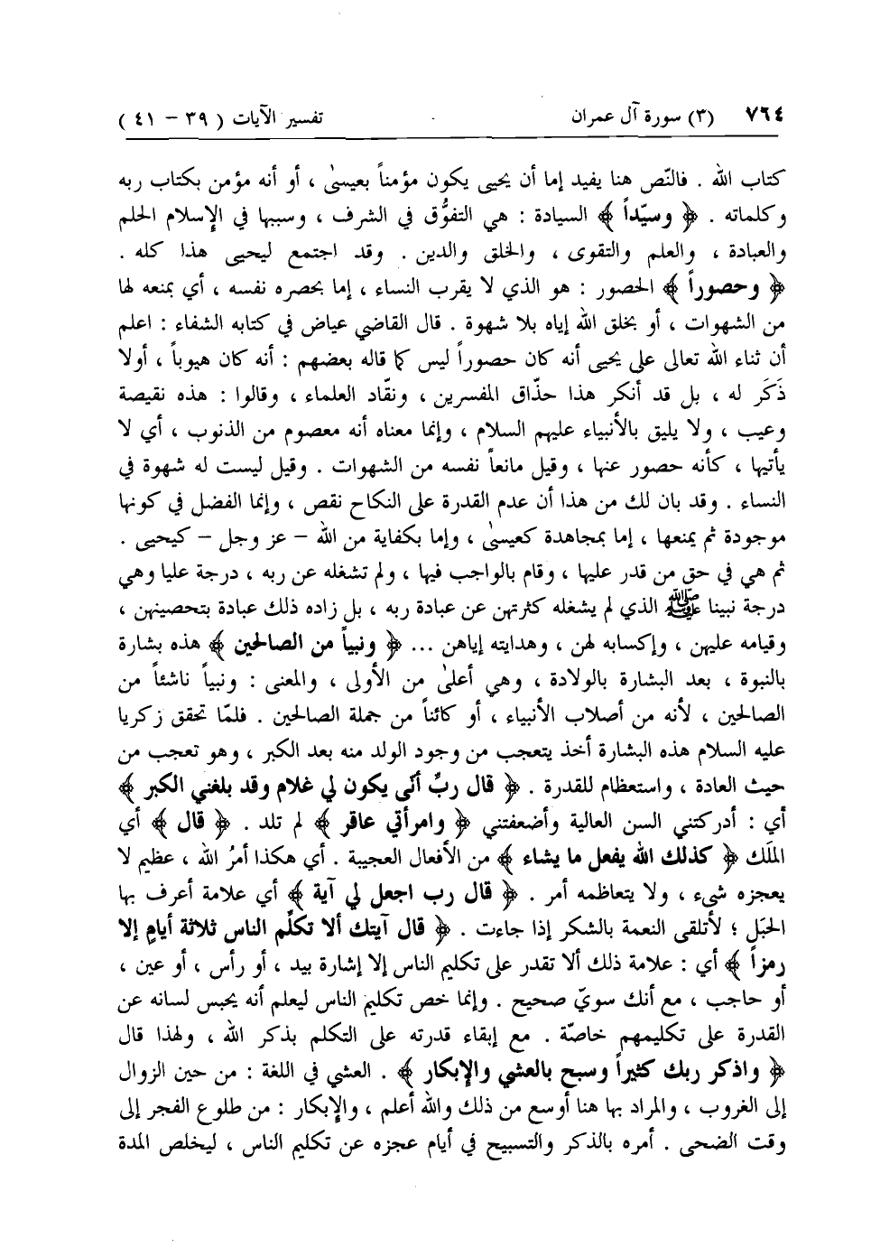 قالَ رَبِّ اجْعَلْ لِي آيَةً أي علامة أعرف بها الحبل؛ لأتلقى النعمة بالشكر إذا جاءت. قالَ آيَتُكَ أَلَّا تُكَلِّمَ النَّاسَ ثَلاثَةَ أَيَّامٍ إِلَّا رَمْزاً أي: علامة ذلك ألا تقدر على تكليم الناس إلا إشارة بيد، أو رأس، أو عين، أو حاجب، مع أنك سوي صحيح. وإنما خص تكليم الناس ليعلم أنه يحبس لسانه عن القدرة على تكليمهم خاصة. مع إبقاء قدرته على التكلم بذكر الله، ولهذا قال وَاذْكُرْ رَبَّكَ كَثِيراً وَسَبِّحْ بِالْعَشِيِّ وَالْإِبْكارِ. العشي في اللغة: من حين الزوال إلى الغروب، والمراد بها هنا أوسع من ذلك والله أعلم، والإبكار: من طلوع الفجر إلى وقت الضحى. أمره بالذكر والتسبيح في أيام عجزه عن تكليم الناس، ليخلص المدة
