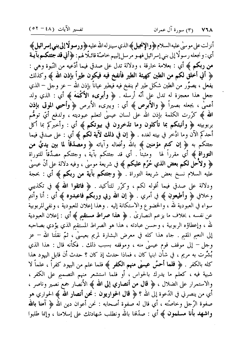أَنِّي أَخْلُقُ لَكُمْ مِنَ الطِّينِ كَهَيْئَةِ الطَّيْرِ فَأَنْفُخُ فِيهِ فَيَكُونُ طَيْراً بِإِذْنِ اللَّهِ وكذلك يفعل، يصور من الطين شكل طير ثم ينفخ فيه فيطير عيانا بإذن الله- عزّ وجل- الذي جعل هذا معجزة له تدل على أنه أرسله. وَأُبْرِئُ الْأَكْمَهَ أي: الذي ولد أعمى، يجعله بصيرا وَالْأَبْرَصَ أي: ويبرئ الأبرص وَأُحْيِ الْمَوْتى بِإِذْنِ اللَّهِ كررت الكلمة بإذن الله على لسان عيسى لتعلم عبوديته، ولدفع أي توهم بربوبيته وَأُنَبِّئُكُمْ بِما تَأْكُلُونَ وَما تَدَّخِرُونَ فِي بُيُوتِكُمْ أي: وأخبركم بما أكل أحدكم الآن وما ادخر في بيته لغده. إِنَّ فِي ذلِكَ لَآيَةً لَكُمْ أي: على صدقي فيما جئتكم به إِنْ كُنْتُمْ مُؤْمِنِينَ بالله وأفعاله وآياته