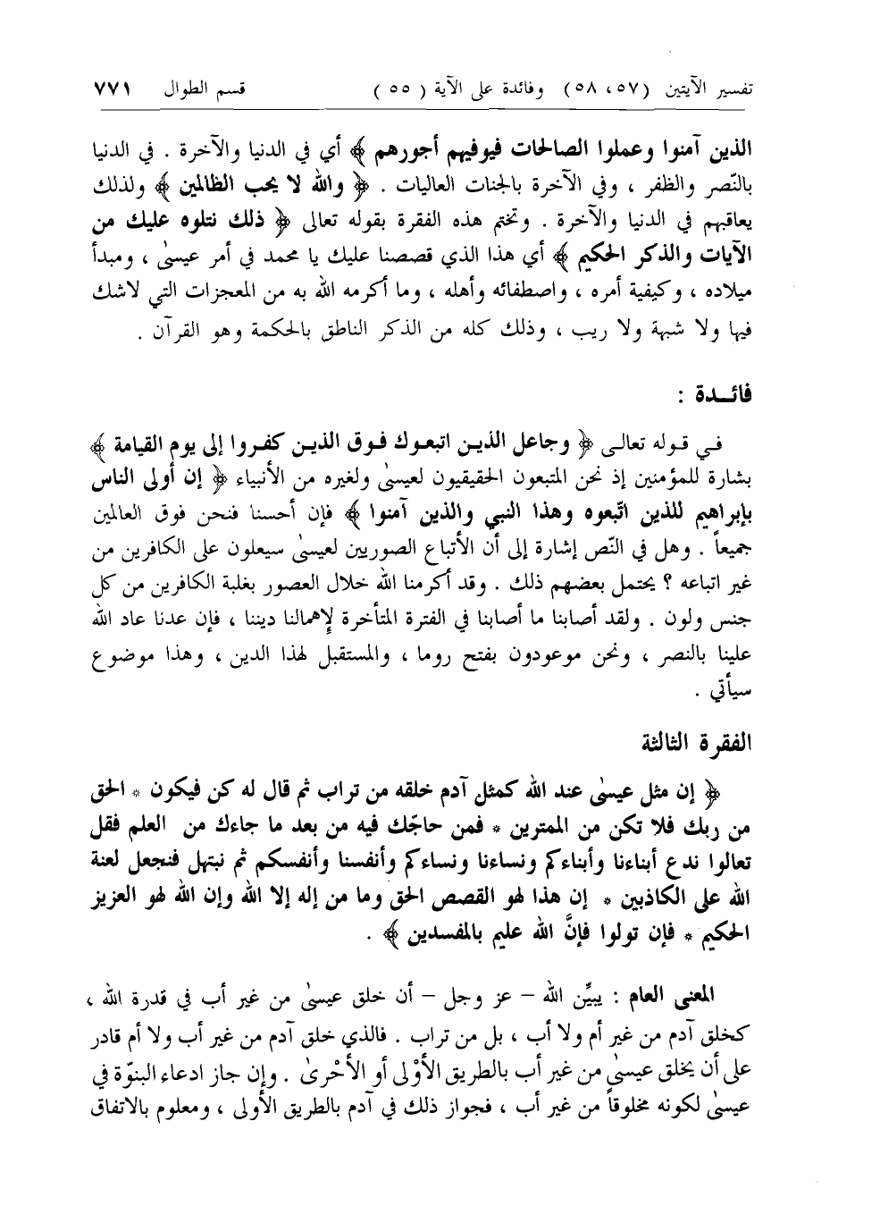 يبين الله- عزّ وجل- أن خلق عيسى من غير أب في قدرة الله، كخلق آدم من غير أم ولا أب، بل من تراب. فالذي خلق آدم من غير أب ولا أم قادر على أن يخلق عيسى من غير أب بالطريق الأولى أو الأحرى. وإن جاز ادعاء البنوة في عيسى لكونه مخلوقا من غير أب، فجواز ذلك في آدم بالطريق الأولى، ومعلوم بالاتفاق