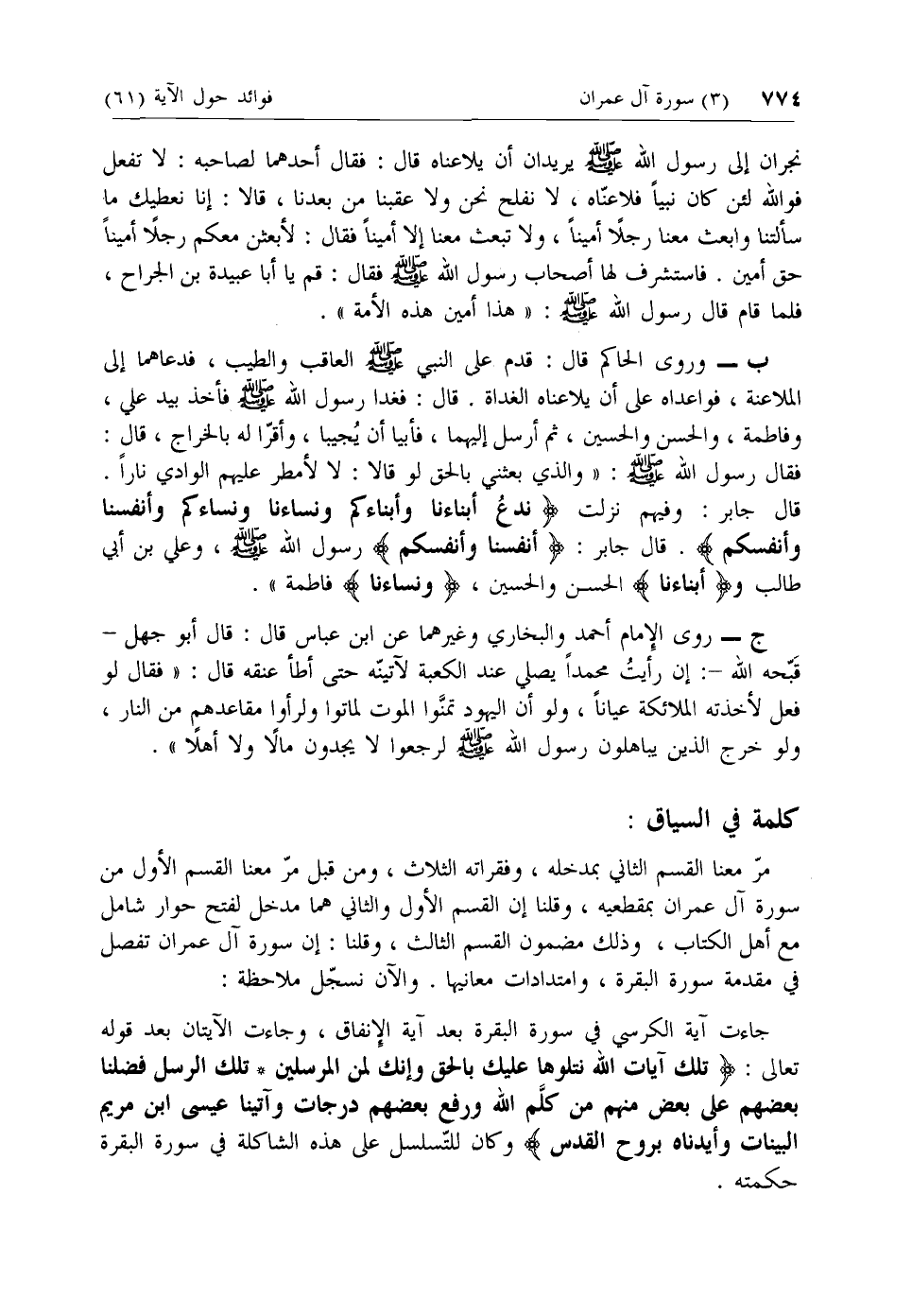 ب- وروى الحاكم قال: قدم على النبي صلى الله عليه وسلم العاقب والطيب، فدعاهما إلى الملاعنة، فواعداه على أن يلاعناه الغداة. قال: فغدا رسول الله صلى الله عليه وسلم فأخذ بيد علي، وفاطمة، والحسن والحسين، ثم أرسل إليهما، فأبيا أن يجيبا، وأقرا له بالخراج، قال: