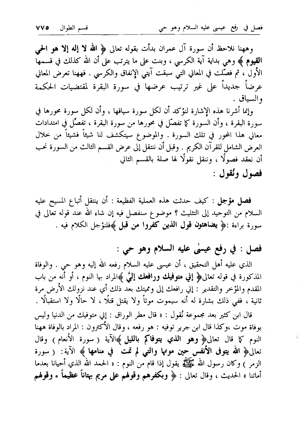 امتدادات معاني هذا المحور في تلك السورة. والموضوع سيتكشف لنا شيئا فشيئا من خلال العرض الشامل للقرآن الكريم. وقبل أن ننتقل إلى عرض القسم الثالث من السورة نحب أن نعقد فصولا، وننقل نقولا لها صلة بالقسم الثاني