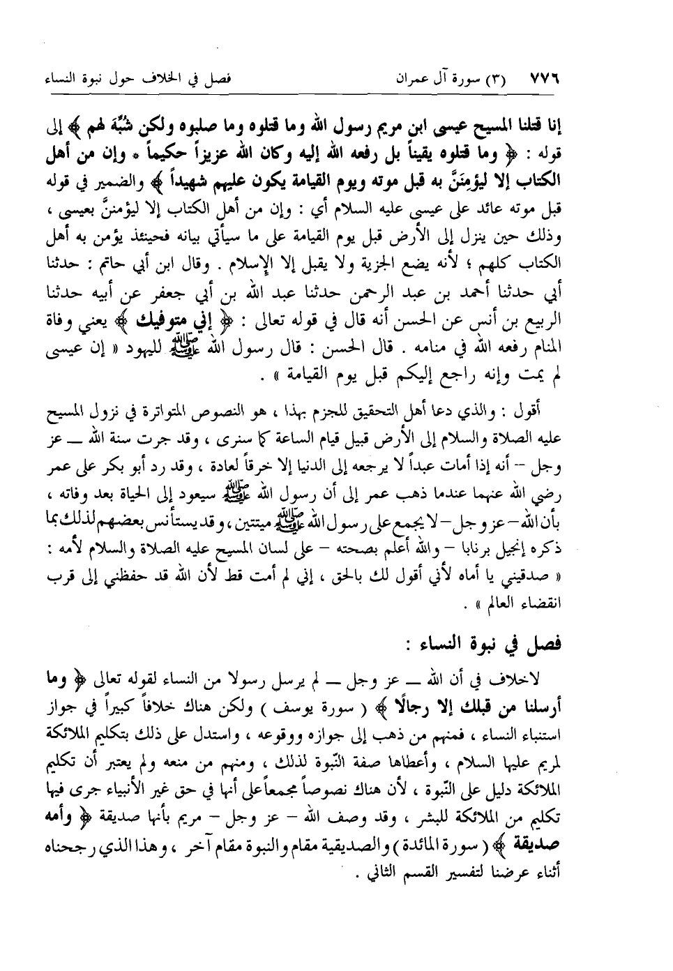 إِنَّا قَتَلْنَا الْمَسِيحَ عِيسَى ابْنَ مَرْيَمَ رَسُولَ اللَّهِ وَما قَتَلُوهُ وَما صَلَبُوهُ وَلكِنْ شُبِّهَ لَهُمْ إلى قوله: وَما قَتَلُوهُ يَقِيناً بَلْ رَفَعَهُ اللَّهُ إِلَيْهِ وَكانَ اللَّهُ عَزِيزاً حَكِيماً* وَإِنْ مِنْ أَهْلِ الْكِتابِ إِلَّا لَيُؤْمِنَنَّ بِهِ قَبْلَ مَوْتِهِ وَيَوْمَ الْقِيامَةِ يَكُونُ عَلَيْهِمْ شَهِيداً والضمير في قوله قبل موته عائد على عيسى عليه السلام أي: وإن من أهل الكتاب إلا ليؤمنن بعيسى، وذلك حين ينزل إلى الأرض قبل يوم القيامة على ما سيأتي بيانه فحينئذ يؤمن به أهل الكتاب كلهم؛ لأنه يضع الجزية ولا يقبل إلا الإسلام. وقال ابن أبي حاتم: حدثنا أبي حدثنا أحمد بن عبد الرحمن حدثنا عبد الله بن أبي جعفر عن أبيه حدثنا الربيع بن أنس عن الحسن أنه قال في قوله تعالى: إِنِّي مُتَوَفِّيكَ يعني وفاة المنام رفعه الله في منامه. قال الحسن: قال رسول الله صلى الله عليه وسلم لليهود «إن عيسى لم يمت وإنه راجع إليكم قبل يوم القيامة».