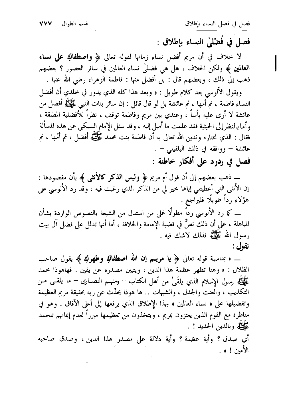 ويقول الألوسي بعد كلام طويل: «وبعد هذا كله الذي يدور في خلدي أن أفضل النساء فاطمة، ثم أمها، ثم عائشة بل لو قال قائل: إن سائر بنات النبي صلى الله عليه وسلم أفضل من عائشة لا أرى عليه بأسا، وعندي بين مريم وفاطمة توقف، نظرا للأفضلية المطلقة، وأما بالنظر إلى الحيثية فقد علمت ما أميل إليه، وقد سئل الإمام السبكي عن هذه المسألة فقال: الذي نختاره وندين الله تعالى به أن فاطمة بنت محمد صلى الله عليه وسلم أفضل، ثم أمها، ثم عائشة- ووافقه في ذلك البلقيني-.