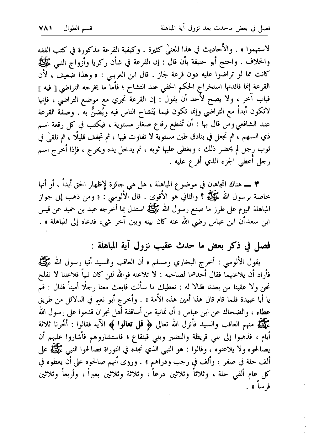 يقول الألوسي: أخرج البخاري ومسلم «أن العاقب والسيد أتيا رسول الله صلى الله عليه وسلم فأراد أن يلاعنهما فقال أحدهما لصاحبه: لا تلاعنه فو الله لئن كان نبيا فلاعننا لا نفلح نحن ولا عقبنا من بعدنا فقالا له: نعطيك ما سألت فابعث معنا رجلا أمينا فقال: قم يا أبا عبيدة فلما قام قال هذا أمين هذه الأمة». وأخرج أبو نعيم في الدلائل من طريق عطاء، والضحاك عن ابن عباس «أن ثمانية من أساقفة أهل نجران قدموا على رسول الله صلى الله عليه وسلم منهم العاقب والسيد فأنزل الله تعالى فَقُلْ تَعالَوْا الآية فقالوا: أخرنا ثلاثة أيام، فذهبوا إلى بني قريظة والنضير وبني قينقاع؛ فاستشاروهم فأشاروا عليهم أن يصالحوه ولا يلاعنوه، وقالوا: هو النبي الذي نجده في التوراة فصالحوا النبي صلى الله عليه وسلم على ألف حلة في صفر، وألف في رجب ودراهم». وروى أنهم صالحوه على أن يعطوه في كل عام ألفي حلة، وثلاثا وثلاثين درعا، وثلاثة وثلاثين بعيرا، وأربعا وثلاثين فرسا».