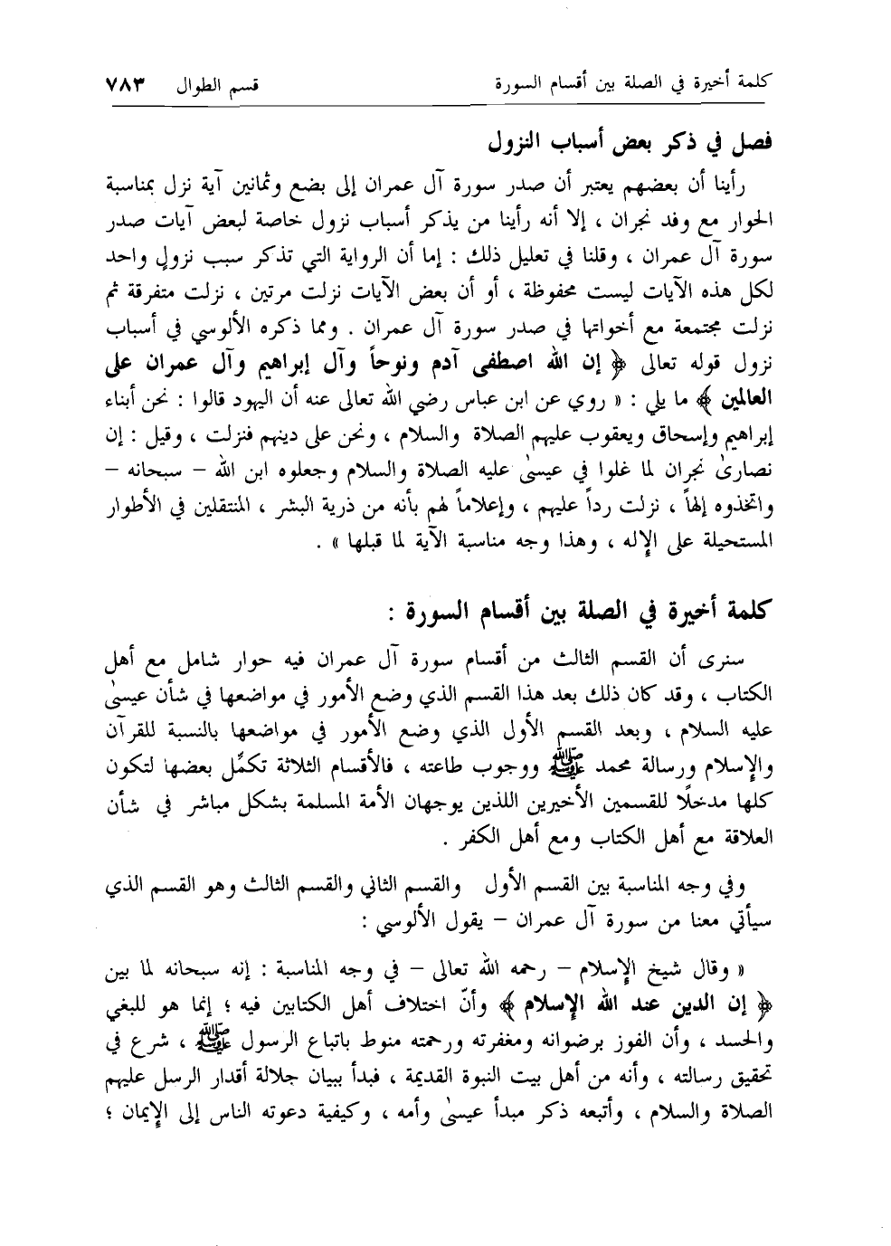 وفي وجه المناسبة بين القسم الأول والقسم الثاني والقسم الثالث وهو القسم الذي سيأتي معنا من سورة آل عمران- يقول الألوسي: