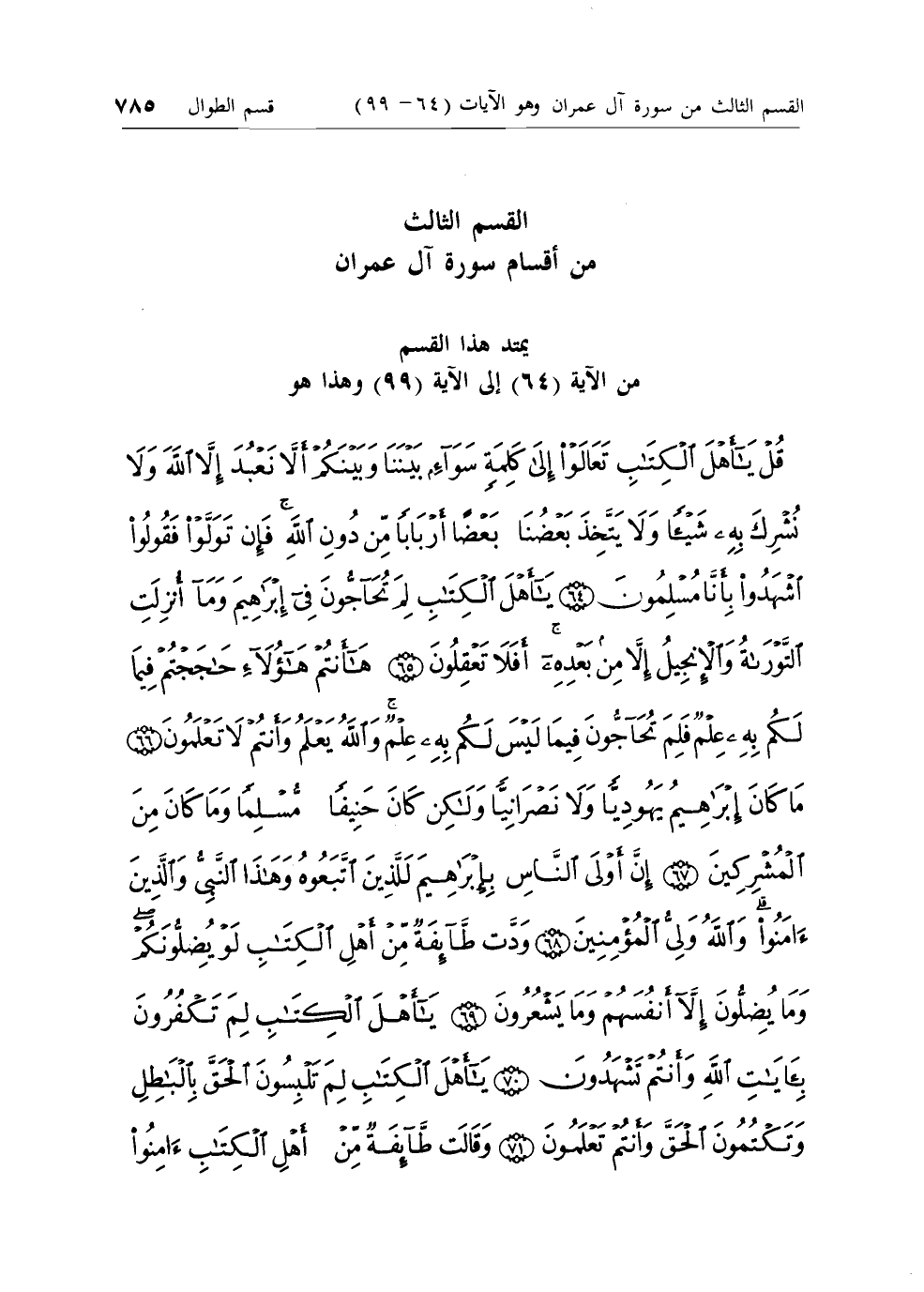 قُلْ يا أَهْلَ الْكِتابِ تَعالَوْا إِلى كَلِمَةٍ سَواءٍ بَيْنَنا وَبَيْنَكُمْ أَلاَّ نَعْبُدَ إِلاَّ اللَّهَ وَلا نُشْرِكَ بِهِ شَيْئاً وَلا يَتَّخِذَ بَعْضُنا بَعْضاً أَرْباباً مِنْ دُونِ اللَّهِ فَإِنْ تَوَلَّوْا فَقُولُوا اشْهَدُوا بِأَنَّا مُسْلِمُونَ (64) يا أَهْلَ الْكِتابِ لِمَ تُحَاجُّونَ فِي إِبْراهِيمَ وَما أُنْزِلَتِ التَّوْراةُ وَالْإِنْجِيلُ إِلاَّ مِنْ بَعْدِهِ أَفَلا تَعْقِلُونَ (65) ها أَنْتُمْ هؤُلاءِ حاجَجْتُمْ فِيما لَكُمْ بِهِ عِلْمٌ فَلِمَ تُحَاجُّونَ فِيما لَيْسَ لَكُمْ بِهِ عِلْمٌ وَاللَّهُ يَعْلَمُ وَأَنْتُمْ لا تَعْلَمُونَ (66) ما كانَ إِبْراهِيمُ يَهُودِيًّا وَلا نَصْرانِيًّا وَلكِنْ كانَ حَنِيفاً مُسْلِماً وَما كانَ مِنَ الْمُشْرِكِينَ (67) إِنَّ أَوْلَى النَّاسِ بِإِبْراهِيمَ لَلَّذِينَ اتَّبَعُوهُ وَهذَا النَّبِيُّ وَالَّذِينَ آمَنُوا وَاللَّهُ وَلِيُّ الْمُؤْمِنِينَ (68)