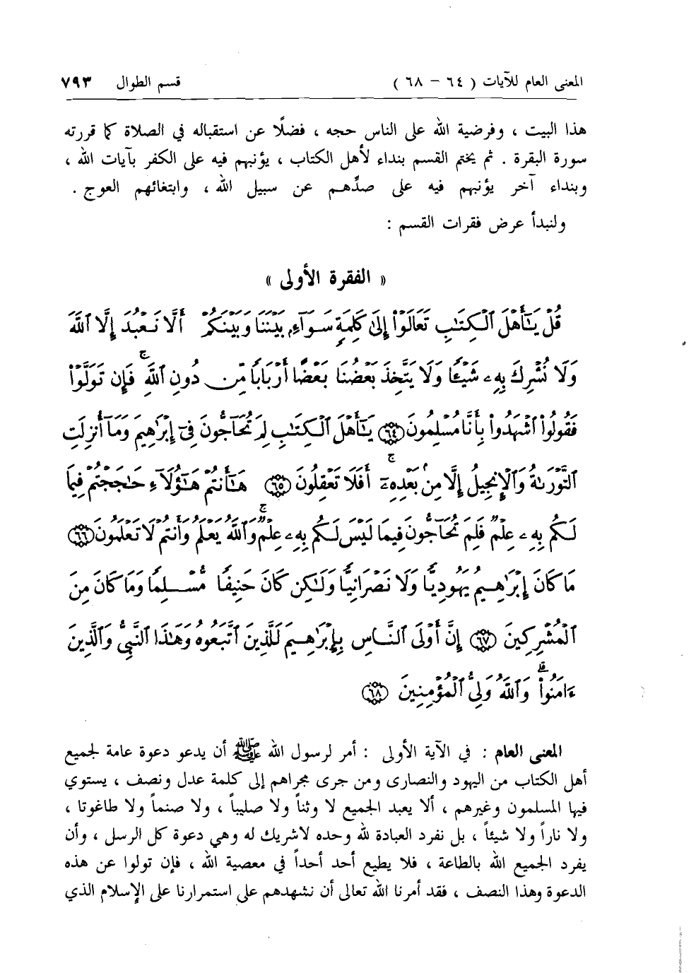 قُلْ يا أَهْلَ الْكِتابِ تَعالَوْا إِلى كَلِمَةٍ سَواءٍ بَيْنَنا وَبَيْنَكُمْ أَلاَّ نَعْبُدَ إِلاَّ اللَّهَ وَلا نُشْرِكَ بِهِ شَيْئاً وَلا يَتَّخِذَ بَعْضُنا بَعْضاً أَرْباباً مِنْ دُونِ اللَّهِ فَإِنْ تَوَلَّوْا فَقُولُوا اشْهَدُوا بِأَنَّا مُسْلِمُونَ (64) يا أَهْلَ الْكِتابِ لِمَ تُحَاجُّونَ فِي إِبْراهِيمَ وَما أُنْزِلَتِ التَّوْراةُ وَالْإِنْجِيلُ إِلاَّ مِنْ بَعْدِهِ أَفَلا تَعْقِلُونَ (65) ها أَنْتُمْ هؤُلاءِ حاجَجْتُمْ فِيما لَكُمْ بِهِ عِلْمٌ فَلِمَ تُحَاجُّونَ فِيما لَيْسَ لَكُمْ بِهِ عِلْمٌ وَاللَّهُ يَعْلَمُ وَأَنْتُمْ لا تَعْلَمُونَ (66) ما كانَ إِبْراهِيمُ يَهُودِيًّا وَلا نَصْرانِيًّا وَلكِنْ كانَ حَنِيفاً مُسْلِماً وَما كانَ مِنَ الْمُشْرِكِينَ (67) إِنَّ أَوْلَى النَّاسِ بِإِبْراهِيمَ لَلَّذِينَ اتَّبَعُوهُ وَهذَا النَّبِيُّ وَالَّذِينَ آمَنُوا وَاللَّهُ وَلِيُّ الْمُؤْمِنِينَ (68)