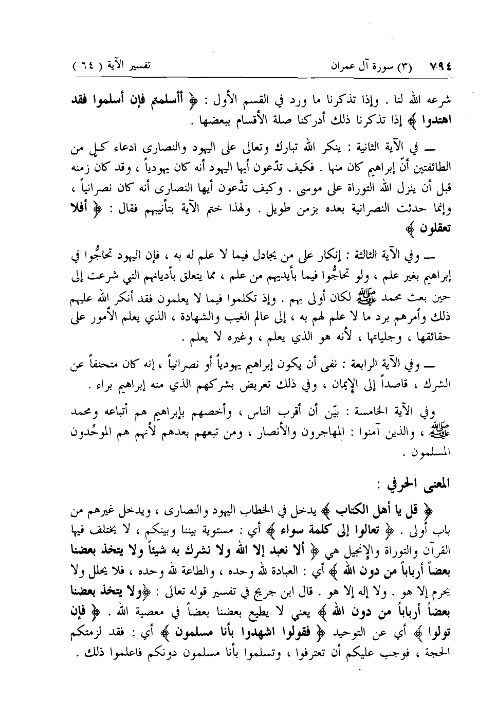 قُلْ يا أَهْلَ الْكِتابِ يدخل في الخطاب اليهود والنصارى، ويدخل غيرهم من باب أولى. تَعالَوْا إِلى كَلِمَةٍ سَواءٍ أي: مستوية بَيْنَنا وَبَيْنَكُمْ، لا يختلف فيها القرآن والتوراة والإنجيل هي أَلَّا نَعْبُدَ إِلَّا اللَّهَ وَلا نُشْرِكَ بِهِ شَيْئاً وَلا يَتَّخِذَ بَعْضُنا بَعْضاً أَرْباباً مِنْ دُونِ اللَّهِ أي: العبادة لله وحده، والطاعة لله وحده، فلا يحلل ولا يحرم إلا هو. ولا إله إلا هو. قال ابن جريج في تفسير قوله تعالى: وَلا يَتَّخِذَ بَعْضُنا بَعْضاً أَرْباباً مِنْ دُونِ اللَّهِ يعني لا يطيع بعضنا بعضا في معصية الله. فَإِنْ تَوَلَّوْا أي عن التوحيد فَقُولُوا اشْهَدُوا بِأَنَّا مُسْلِمُونَ أي: فقد لزمتكم الحجة، فوجب عليكم أن تعترفوا، وتسلموا بأنا مسلمون دونكم فاعلموا ذلك.