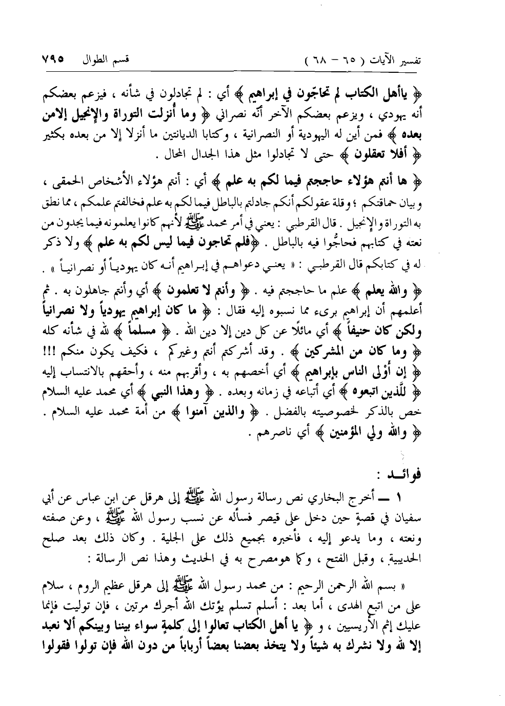 «بسم الله الرحمن الرحيم: من محمد رسول الله صلى الله عليه وسلم إلى هرقل عظيم الروم، سلام على من اتبع الهدى، أما بعد: أسلم تسلم يؤتك الله أجرك مرتين، فإن توليت فإنما عليك إثم الأريسيين، ويا أَهْلَ الْكِتابِ تَعالَوْا إِلى كَلِمَةٍ سَواءٍ بَيْنَنا وَبَيْنَكُمْ أَلَّا نَعْبُدَ إِلَّا اللَّهَ وَلا نُشْرِكَ بِهِ شَيْئاً وَلا يَتَّخِذَ بَعْضُنا بَعْضاً أَرْباباً مِنْ دُونِ اللَّهِ فَإِنْ تَوَلَّوْا فَقُولُوا