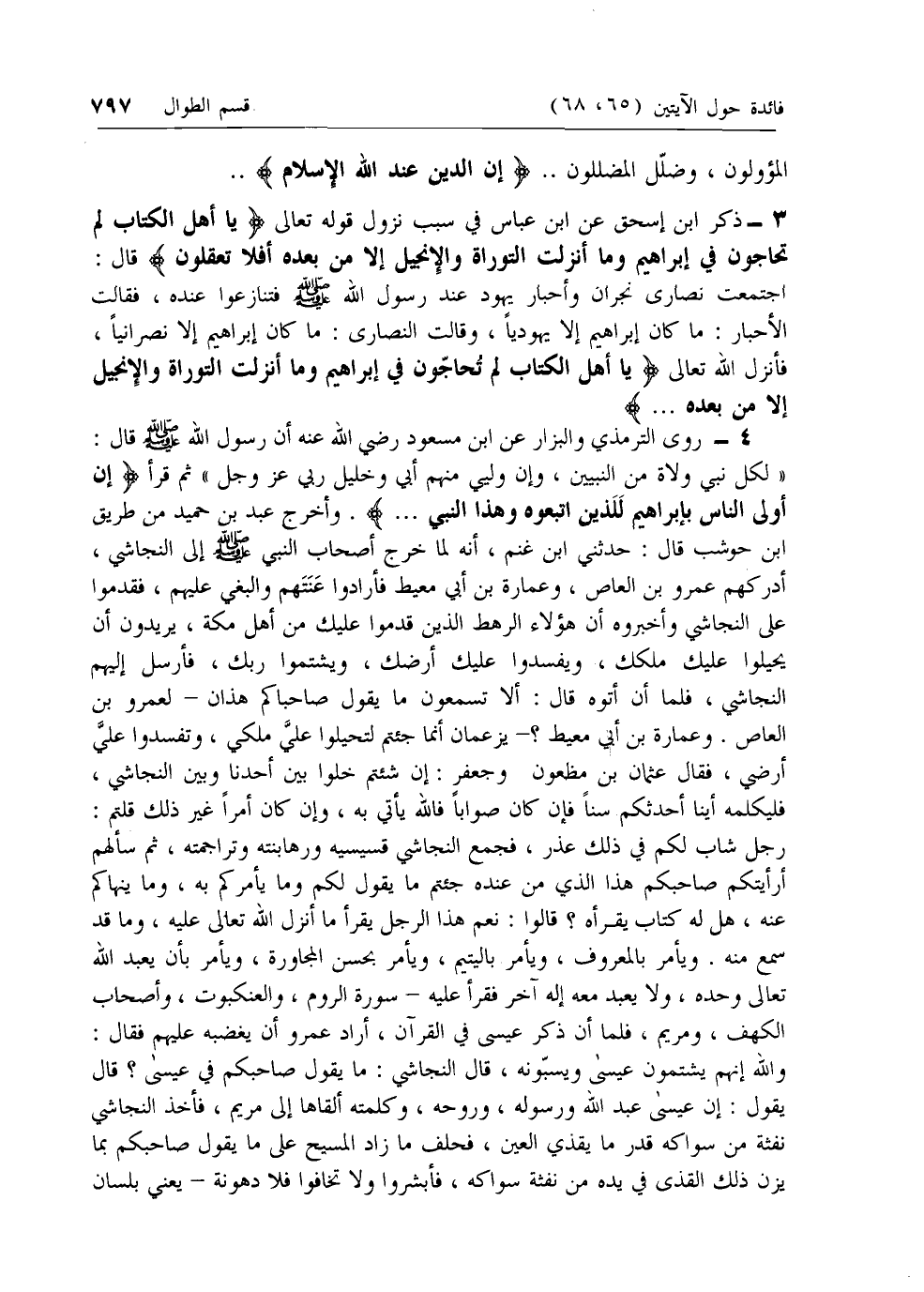 «لكل نبي ولاة من النبيين، وإن وليي منهم أبي وخليل ربي عزّ وجل» ثم قرأ إِنَّ أَوْلَى النَّاسِ بِإِبْراهِيمَ لَلَّذِينَ اتَّبَعُوهُ وَهذَا النَّبِيُّ .... وأخرج عبد بن حميد من طريق ابن حوشب قال: حدثني ابن غنم، أنه لما خرج أصحاب النبي صلى الله عليه وسلم إلى النجاشي، أدركهم عمرو بن العاص، وعمارة بن أبي معيط فأرادوا عنتهم والبغي عليهم، فقدموا على النجاشي وأخبروه أن هؤلاء الرهط الذين قدموا عليك من أهل مكة، يريدون أن يحيلوا عليك ملكك، ويفسدوا عليك أرضك، ويشتموا ربك، فأرسل إليهم النجاشي، فلما أن أتوه قال: ألا تسمعون ما يقول صاحباكم هذان- لعمرو بن العاص. وعمارة بن أبي معيط؟ - يزعمان أنما جئتم لتحيلوا علي ملكي، وتفسدوا علي أرضي، فقال عثمان بن مظعون وجعفر: إن شئتم خلوا بين أحدنا وبين النجاشي، فليكلمه أينا أحدثكم سنا فإن كان صوابا فالله يأتي به، وإن كان أمرا غير ذلك قلتم: