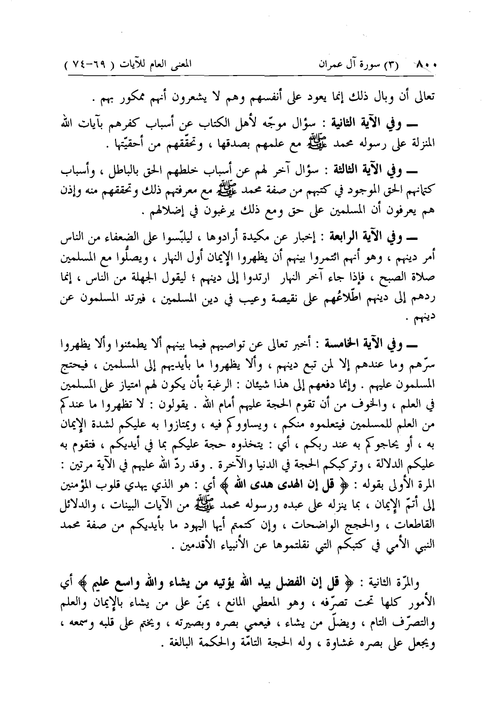 - وفي الآية الخامسة: أخبر تعالى عن تواصيهم فيما بينهم ألا يطمئنوا وألا يظهروا سرهم وما عندهم إلا لمن تبع دينهم، وألا يظهروا ما بأيديهم إلى المسلمين، فيحتج المسلمون عليهم. وإنما دفعهم إلى هذا شيئان: الرغبة بأن يكون لهم امتياز على المسلمين في العلم، والخوف من أن تقوم الحجة عليهم أمام الله. يقولون: لا تظهروا ما عندكم من العلم للمسلمين فيتعلموه منكم، ويساووكم فيه، ويمتازوا به عليكم لشدة الإيمان به، أو يحاجوكم به عند ربكم، أي: يتخذوه حجة عليكم بما في أيديكم، فتقوم به عليكم الدلالة، وتركبكم الحجة في الدنيا والآخرة. وقد رد الله عليهم في الآية مرتين: