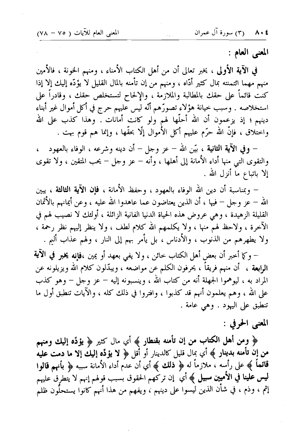 وَمِنْ أَهْلِ الْكِتابِ مَنْ إِنْ تَأْمَنْهُ بِقِنْطارٍ أي مال كثير يُؤَدِّهِ إِلَيْكَ وَمِنْهُمْ مَنْ إِنْ تَأْمَنْهُ بِدِينارٍ أي بمال قليل كالدينار أو أقل لا يُؤَدِّهِ إِلَيْكَ إِلَّا ما دُمْتَ عَلَيْهِ قائِماً على رأسه، ملازما له ذلِكَ أي أن عدم أداء الأمانة سببه بِأَنَّهُمْ قالُوا لَيْسَ عَلَيْنا فِي الْأُمِّيِّينَ سَبِيلٌ أي إن تركهم الحقوق بسبب قولهم إنهم لا يتطرق عليهم إثم، وذم، في شأن الذين ليسوا على دينهم، ويفهم من هذا أنهم كانوا يستحلون ظلم