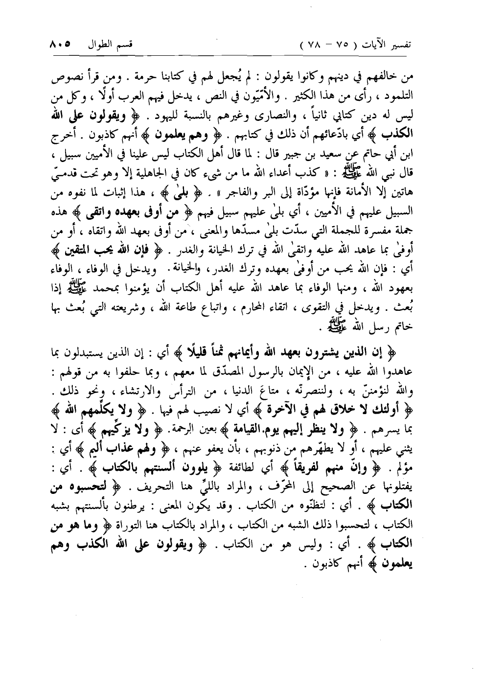من خالفهم في دينهم وكانوا يقولون: لم يجعل لهم في كتابنا حرمة. ومن قرأ نصوص التلمود، رأى من هذا الكثير. والأميون في النص، يدخل فيهم العرب أولا، وكل من ليس له دين كتابي ثانيا، والنصارى وغيرهم بالنسبة لليهود. وَيَقُولُونَ عَلَى اللَّهِ الْكَذِبَ أي بادعائهم أن ذلك في كتابهم. وَهُمْ يَعْلَمُونَ أنهم كاذبون. أخرج ابن أبي حاتم عن سعيد بن جبير قال: لما قال أهل الكتاب ليس علينا في الأميين سبيل، قال نبي الله صلى الله عليه وسلم: «كذب أعداء الله ما من شئ كان في الجاهلية إلا وهو تحت قدمي هاتين إلا الأمانة فإنها مؤداة إلى البر والفاجر».