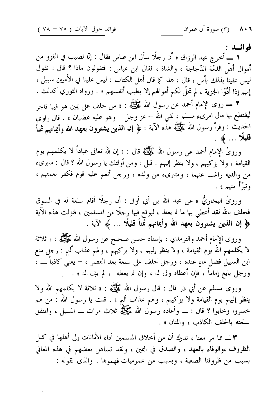 2 - روى الإمام أحمد عن رسول الله صلى الله عليه وسلم: «من حلف على يمين هو فيها فاجر ليقتطع بها مال امرئ مسلم، لقي الله- عزّ وجل- وهو عليه غضبان». قال راوي الحديث: وقرأ رسول الله صلى الله عليه وسلم هذه الآية: إِنَّ الَّذِينَ يَشْتَرُونَ بِعَهْدِ اللَّهِ وَأَيْمانِهِمْ ثَمَناً قَلِيلًا ...