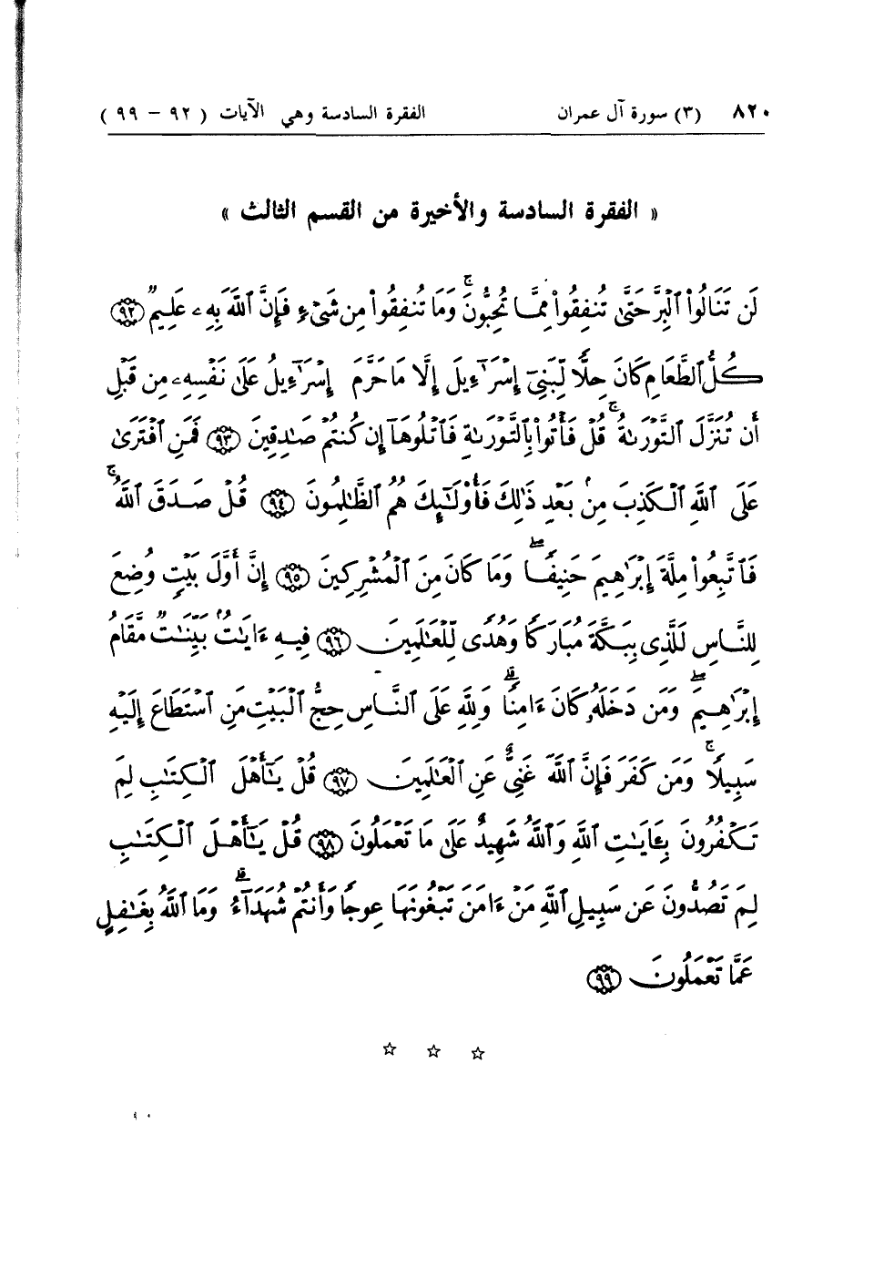لَنْ تَنالُوا الْبِرَّ حَتَّى تُنْفِقُوا مِمَّا تُحِبُّونَ وَما تُنْفِقُوا مِنْ شَيْءٍ فَإِنَّ اللَّهَ بِهِ عَلِيمٌ (92) كُلُّ الطَّعامِ كانَ حِلاًّ لِبَنِي إِسْرائِيلَ إِلاَّ ما حَرَّمَ إِسْرائِيلُ عَلى نَفْسِهِ مِنْ قَبْلِ أَنْ تُنَزَّلَ التَّوْراةُ قُلْ فَأْتُوا بِالتَّوْراةِ فَاتْلُوها إِنْ كُنْتُمْ صادِقِينَ (93) فَمَنِ افْتَرى عَلَى اللَّهِ الْكَذِبَ مِنْ بَعْدِ ذلِكَ فَأُولئِكَ هُمُ الظَّالِمُونَ (94) قُلْ صَدَقَ اللَّهُ فَاتَّبِعُوا مِلَّةَ إِبْراهِيمَ حَنِيفاً وَما كانَ مِنَ الْمُشْرِكِينَ (95) إِنَّ أَوَّلَ بَيْتٍ وُضِعَ لِلنَّاسِ لَلَّذِي بِبَكَّةَ مُبارَكاً وَهُدىً لِلْعالَمِينَ (96)