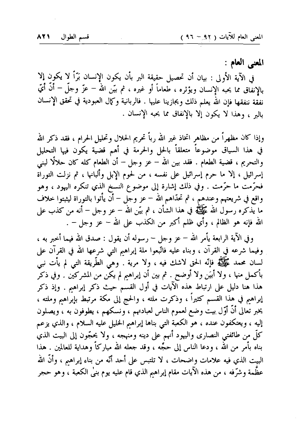 وفي الآية الرابعة يأمر الله- عزّ وجل- رسوله أن يقول: صدق الله فيما أخبر به، وفيما شرعه في القرآن، وبناء عليه فاتبعوا ملة إبراهيم التي شرعها الله في القرآن على لسان محمد صلى الله عليه وسلم فإنه الحق لا شك فيه، ولا مرية. وهي الطريقة التي لم يأت نبي بأكمل منها، ولا أبين ولا أوضح. ثم بين أن إبراهيم لم يكن من المشركين. وفي ذكر هذا هنا دليل على ارتباط هذه الآيات في أول القسم حيث ذكر إبراهيم. وإذ ذكر إبراهيم في هذا القسم كثيرا، وذكرت ملته، والحج إلى مكة مرتبط بإبراهيم وملته، يخبر تعالى أن أول بيت وضع لعموم الناس لعبادتهم، ونسكهم، يطوفون به، ويصلون إليه، ويعتكفون عنده، هو الكعبة التي بناها إبراهيم الخليل عليه السلام، والذي يزعم كل من طائفتي النصارى واليهود أنهم على دينه ومنهجه، ولا يحجون إلى البيت الذي بناه بأمر من الله، ودعا الناس إلى حجه، وقد جعله الله مباركا وهداية للعالمين. هذا البيت الذي فيه علامات واضحات، لا تلتبس على أحد أنه من بناء إبراهيم، وأن الله عظمة وشرفه، من هذه الآيات مقام إبراهيم الذي قام عليه يوم بنى الكعبة، وهو حجر