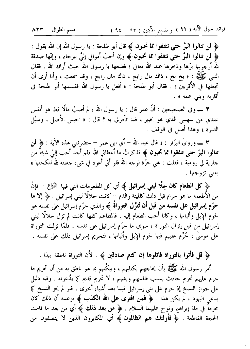 3 - وروى البزار: «قال عبد الله- أي ابن عمر- حضرتني هذه الآية: لَنْ تَنالُوا الْبِرَّ حَتَّى تُنْفِقُوا مِمَّا تُحِبُّونَ فذكرت ما أعطاني الله فلم أجد أحب إلي شيئا من جارية لي رومية، فقلت: هي حرة لوجه الله فلو أني أعود في شئ جعلته لله لنكحتها» يعني تزوجتها.