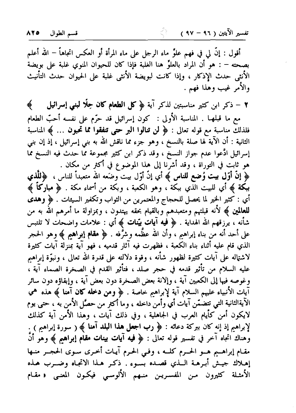 فِيهِ آياتٌ بَيِّناتٌ أي: علامات واضحات لا تلتبس على أحد أنه من بناء إبراهيم، وأن الله عظمه وشرفه. مَقامُ إِبْراهِيمَ وهو الحجر الذي قام عليه أثناء بناء الكعبة، فظهرت فيه آثار قدميه، فهو آية بمنزلة آيات كثيرة لاشتماله على آيات كثيرة لظهور شأنه، وقوة دلالته على قدرة الله تعالى، ونبوة إبراهيم عليه السلام من تأثير قدمه في حجر صلد، فتأثير القدم في الصخرة الصماء آية، وغوصه فيها إلى الكعبين آية، وإلانة بعض الصخرة دون بعض آية، وإبقاؤه دون سائر آيات الأنبياء عليهم السلام آية لإبراهيم خاصة. وَمَنْ دَخَلَهُ كانَ آمِناً هذه هي الآية الثانية التي تتضمن آيات أي وأمن داخله، وما أكثر من حصل الأمن به، حتى يوم لا يكون أمن كأيام العرب في الجاهلية، وفي ذلك آيات، وهذا الأمن آية كذلك لإبراهيم إذ إنه كان ببركة دعائه: رَبِّ اجْعَلْ هَذَا الْبَلَدَ آمِناً (سورة إبراهيم).