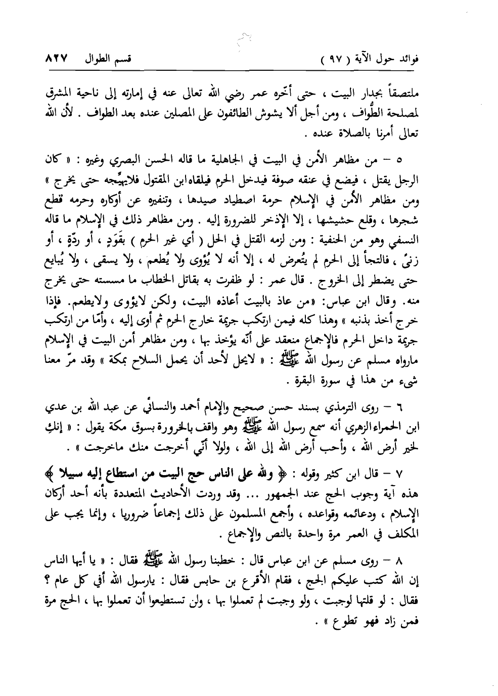 7 - قال ابن كثير وقوله: وَلِلَّهِ عَلَى النَّاسِ حِجُّ الْبَيْتِ مَنِ اسْتَطاعَ إِلَيْهِ سَبِيلًا هذه آية وجوب الحج عند الجمهور ... وقد وردت الأحاديث المتعددة بأنه أحد أركان الإسلام، ودعائمه وقواعده، وأجمع المسلمون على ذلك إجماعا ضروريا، وإنما يجب على المكلف في العمر مرة واحدة بالنص والإجماع.