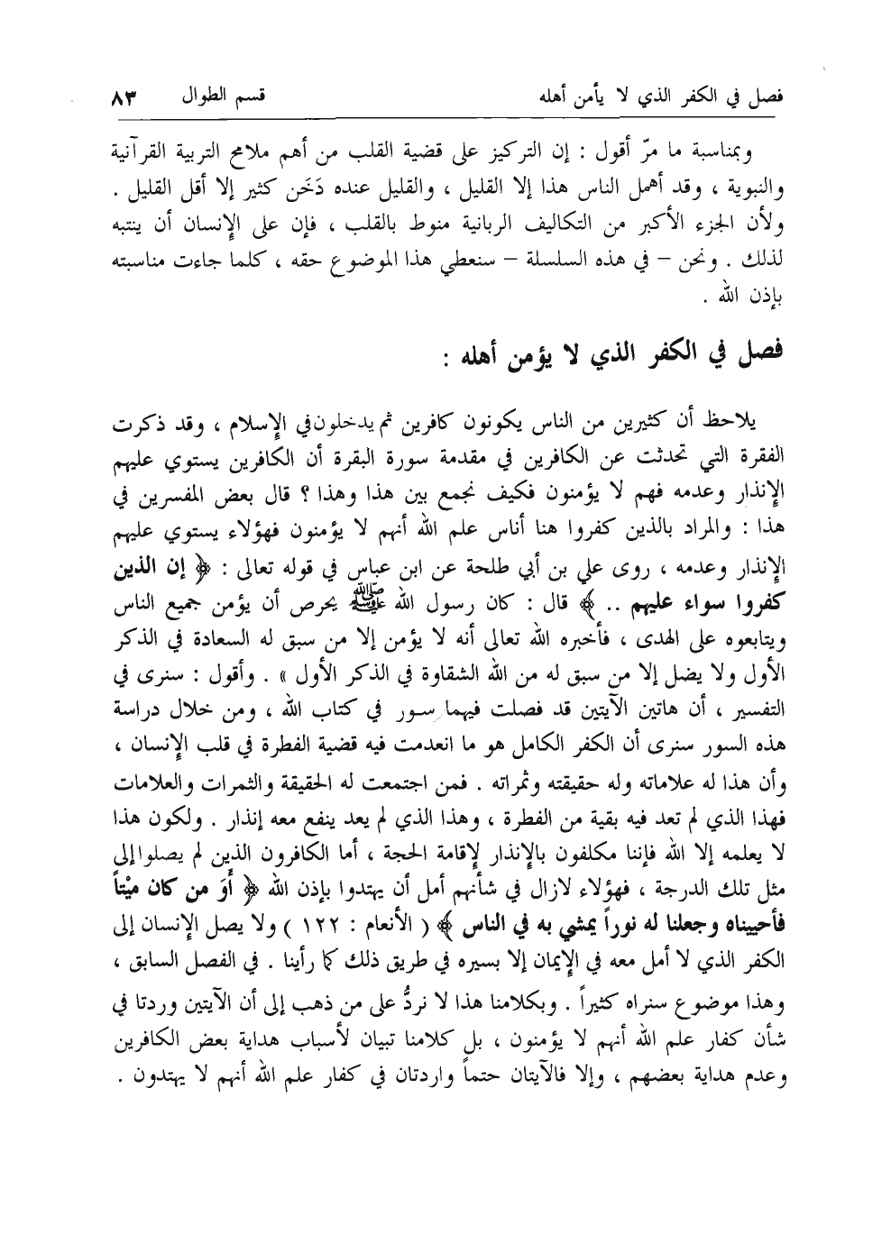 يلاحظ أن كثيرين من الناس يكونون كافرين ثم يدخلون في الإسلام، وقد ذكرت الفقرة التي تحدثت عن الكافرين في مقدمة سورة البقرة أن الكافرين يستوي عليهم الإنذار وعدمه فهم لا يؤمنون فكيف نجمع بين هذا وهذا؟ قال بعض المفسرين في هذا: والمراد بالذين كفروا هنا أناس علم الله أنهم لا يؤمنون فهؤلاء يستوي عليهم الإنذار وعدمه، روى علي بن أبي طلحة عن ابن عباس في قوله تعالى: إِنَّ الَّذِينَ كَفَرُوا سَواءٌ عَلَيْهِمْ .. قال: كان رسول الله صلى الله عليه وسلم يحرص أن يؤمن جميع الناس ويتابعوه على الهدى، فأخبره الله تعالى أنه لا يؤمن إلا من سبق له السعادة في الذكر الأول ولا يضل إلا من سبق له من الله تعالى أنه لا يؤمن إلا من سبق له السعادة في الذكر التفسير، أن هاتين الآيتين قد فصلت فيهما سور في كتاب الله، ومن خلال دراسة هذه السور سنرى أن الكفر الكامل هو ما انعدمت فيه قضية الفطرة في قلب الإنسان، وأن هذا له علاماته وله حقيقته وثمراته. فمن اجتمعت له الحقيقة والثمرات والعلامات فهذا الذي لم تعد فيه بقية من الفطرة، وهذا الذي لم يعد ينفع معه إنذار. ولكون هذا لا يعلمه إلا الله فإننا مكلفون بالإنذار لإقامة الحجة، أما الكافرون الذين لم يصلوا إلى مثل تلك الدرجة، فهؤلاء لا زال في شأنهم أمل أن يهتدوا بإذن الله أَوَمَنْ كانَ مَيْتاً فَأَحْيَيْناهُ وَجَعَلْنا لَهُ نُوراً يَمْشِي بِهِ فِي النَّاسِ (الأنعام: 122) ولا يصل الإنسان إلى الكفر الذي لا أمل معه في الإيمان إلا بسيره في طريق ذلك كما رأينا. في الفصل السابق، وهذا موضوع سنراه كثيرا. وبكلامنا هذا لا نرد على من ذهب إلى أن الآيتين وردتا في شأن كفار علم الله أنهم لا يؤمنون، بل كلامنا تبيان لأسباب هداية بعض الكافرين وعدم هداية بعضهم، وإلا فالآيتان حتما واردتان في كفار علم الله أنهم لا يهتدون.