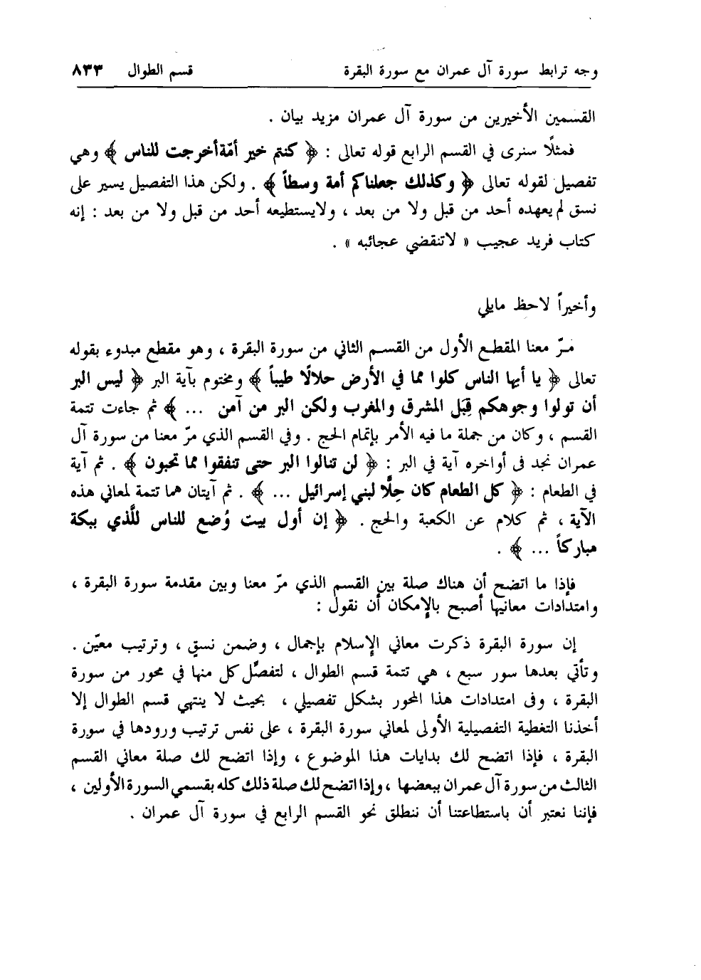 وتأتي بعدها سور سبع، هي تتمة قسم الطوال، لتفصل كل منها في محور من سورة البقرة، وفى امتدادات هذا المحور بشكل تفصيلي، بحيث لا ينتهي قسم الطوال إلا أخذنا التغطية التفصيلية الأولى لمعاني سورة البقرة، على نفس ترتيب ورودها في سورة البقرة، فإذا اتضح لك بدايات هذا الموضوع، وإذا اتضح لك صلة معاني القسم الثالث من سورة آل عمران ببعضها، وإذا اتضح لك صلة ذلك كله بقسمي السورة الأولين، فإننا نعتبر أن باستطاعتنا أن ننطلق نحو القسم الرابع في سورة آل عمران.