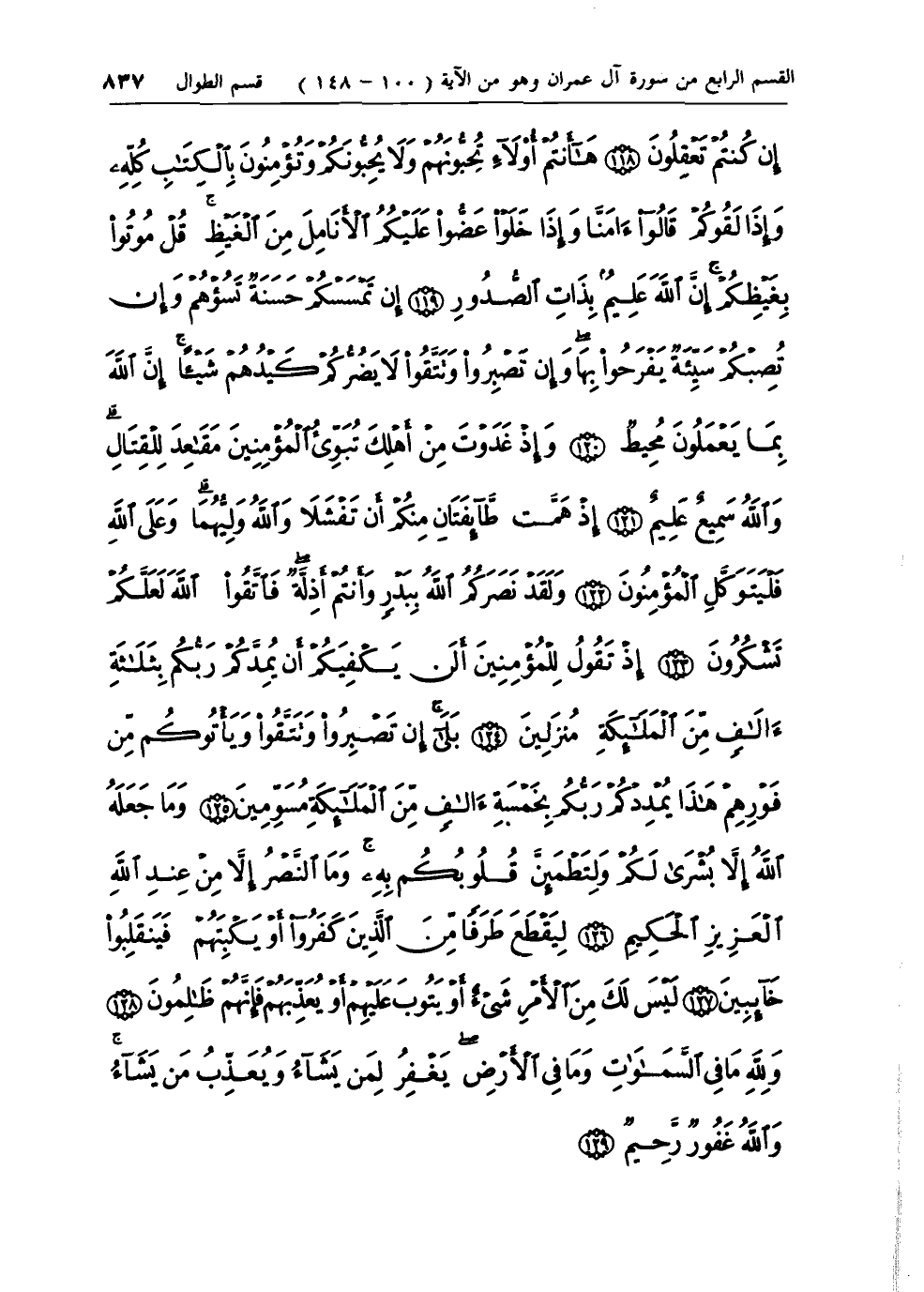 وَلَقَدْ نَصَرَكُمُ اللَّهُ بِبَدْرٍ وَأَنْتُمْ أَذِلَّةٌ فَاتَّقُوا اللَّهَ لَعَلَّكُمْ تَشْكُرُونَ (123) إِذْ تَقُولُ لِلْمُؤْمِنِينَ أَلَنْ يَكْفِيَكُمْ أَنْ يُمِدَّكُمْ رَبُّكُمْ بِثَلاثَةِ آلافٍ مِنَ الْمَلائِكَةِ مُنْزَلِينَ (124) بَلى إِنْ تَصْبِرُوا وَتَتَّقُوا وَيَأْتُوكُمْ مِنْ فَوْرِهِمْ هذا يُمْدِدْكُمْ رَبُّكُمْ بِخَمْسَةِ آلافٍ مِنَ الْمَلائِكَةِ مُسَوِّمِينَ (125) وَما جَعَلَهُ اللَّهُ إِلاَّ بُشْرى لَكُمْ وَلِتَطْمَئِنَّ قُلُوبُكُمْ بِهِ وَمَا النَّصْرُ إِلاَّ مِنْ عِنْدِ اللَّهِ الْعَزِيزِ الْحَكِيمِ (126) لِيَقْطَعَ طَرَفاً مِنَ الَّذِينَ كَفَرُوا أَوْ يَكْبِتَهُمْ فَيَنْقَلِبُوا خائِبِينَ (127)