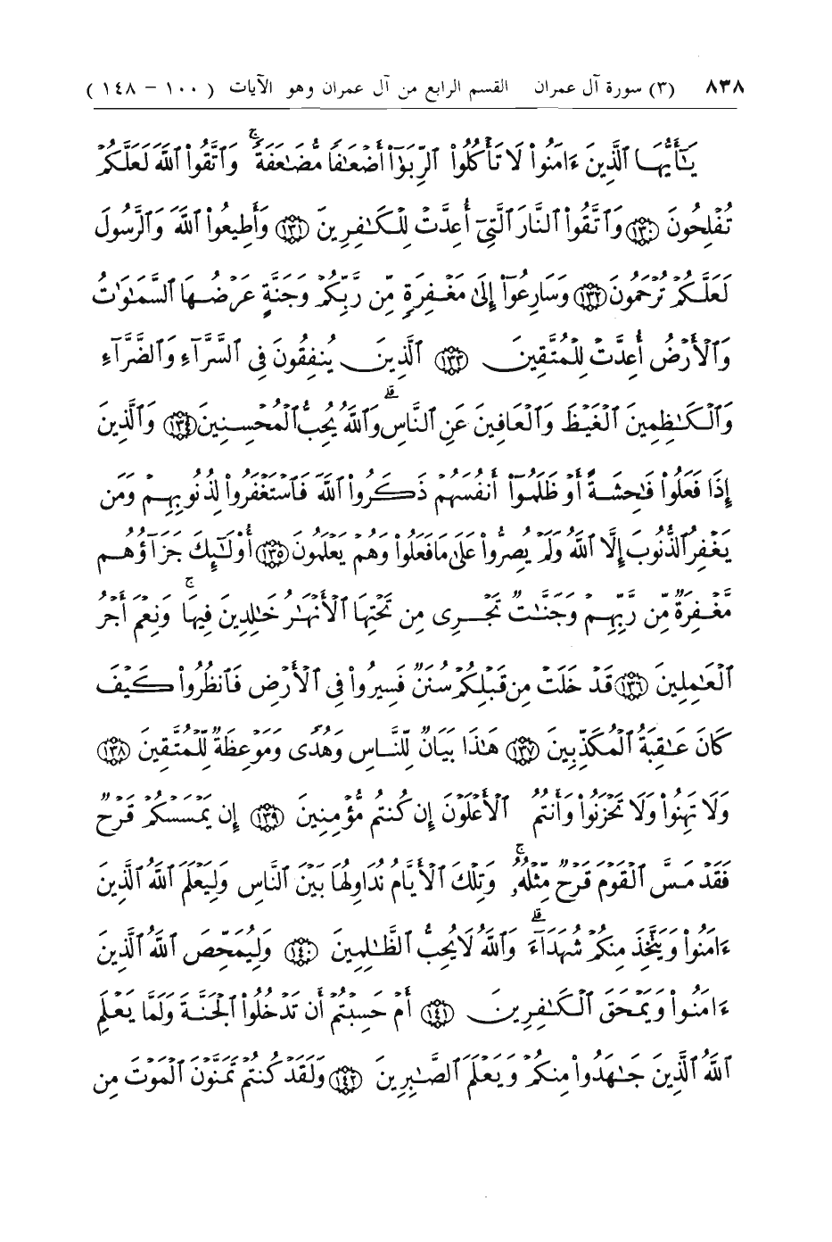 يا أَيُّهَا الَّذِينَ آمَنُوا لا تَأْكُلُوا الرِّبَوا أَضْعافاً مُضاعَفَةً وَاتَّقُوا اللَّهَ لَعَلَّكُمْ تُفْلِحُونَ (130) وَاتَّقُوا النَّارَ الَّتِي أُعِدَّتْ لِلْكافِرِينَ (131) وَأَطِيعُوا اللَّهَ وَالرَّسُولَ لَعَلَّكُمْ تُرْحَمُونَ (132) وَسارِعُوا إِلى مَغْفِرَةٍ مِنْ رَبِّكُمْ وَجَنَّةٍ عَرْضُهَا السَّماواتُ وَالْأَرْضُ أُعِدَّتْ لِلْمُتَّقِينَ (133) الَّذِينَ يُنْفِقُونَ فِي السَّرَّاءِ وَالضَّرَّاءِ وَالْكاظِمِينَ الْغَيْظَ وَالْعافِينَ عَنِ النَّاسِ وَاللَّهُ يُحِبُّ الْمُحْسِنِينَ (134)
