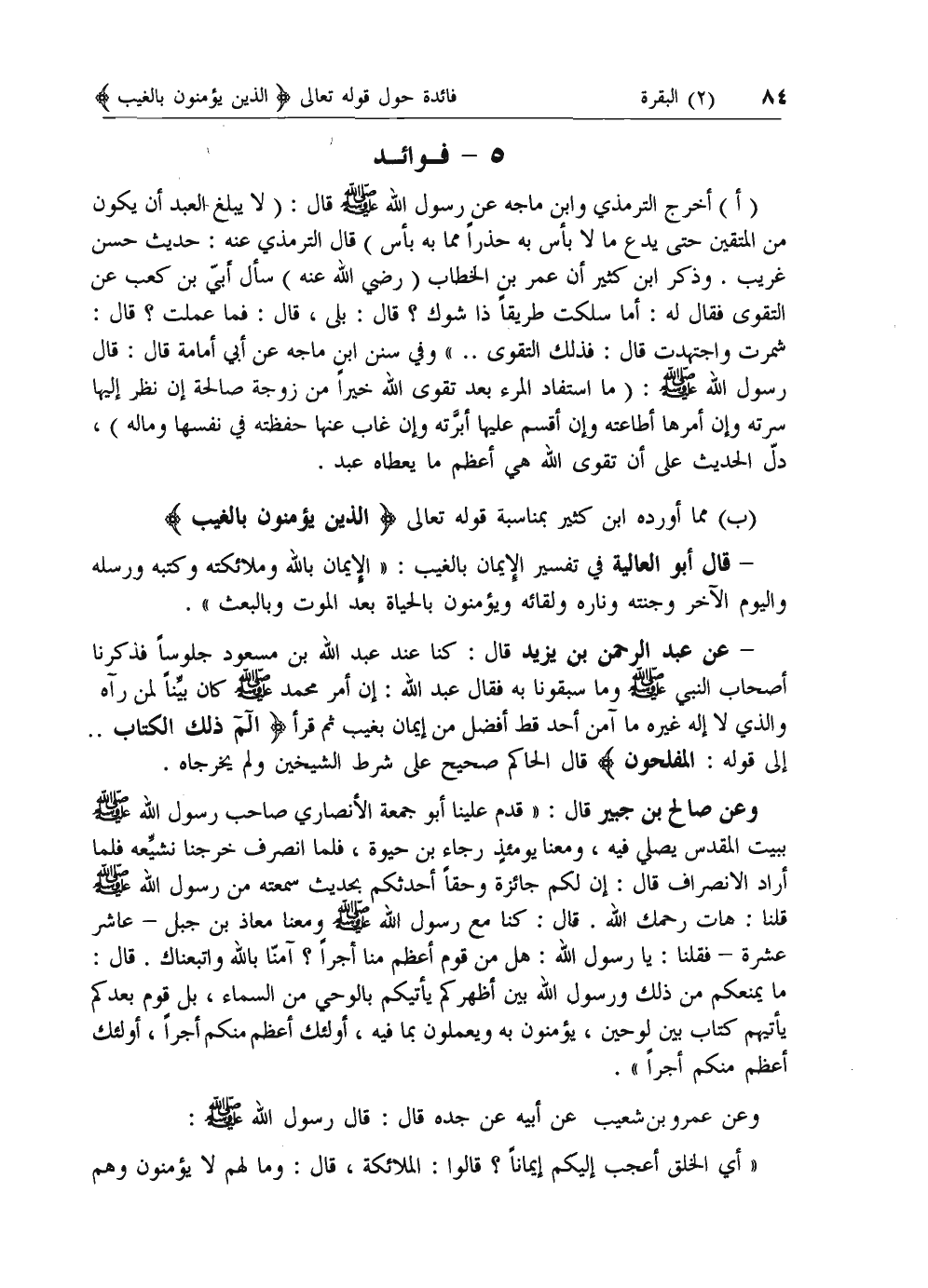 (ب) مما أورده ابن كثير بمناسبة قوله تعالى الَّذِينَ يُؤْمِنُونَ بِالْغَيْبِ