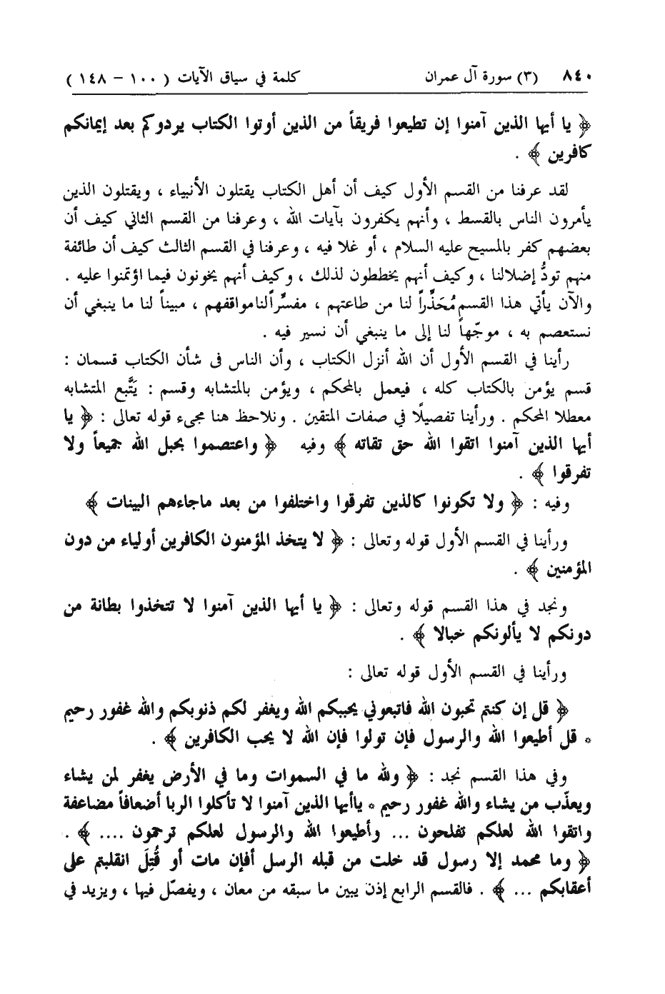 وَما مُحَمَّدٌ إِلَّا رَسُولٌ قَدْ خَلَتْ مِنْ قَبْلِهِ الرُّسُلُ أَفَإِنْ ماتَ أَوْ قُتِلَ انْقَلَبْتُمْ عَلى أَعْقابِكُمْ .... فالقسم الرابع إذن يبين ما سبقه من معان، ويفصل فيها، ويزيد في