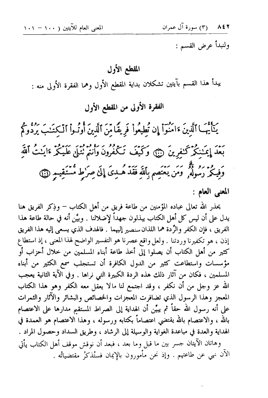 يحذر الله تعالى عباده المؤمنين من طاعة فريق من أهل الكتاب- وذكر الفريق هنا يدل على أن ليس كل أهل الكتاب يبذلون جهدا لإضلالنا. وبين أنه في حالة طاعة هذا الفريق، فإن الكفر والردة هما اللذان سنصير إليهما. فالهدف الذي يسعى إليه هذا الفريق إذن، هو تكفيرنا وردتنا. ولعل واقع عصرنا هو التفسير الواضح لهذا المعنى، إذ استطاع كثير من أهل الكتاب أن يصلوا إلى أخذ طاعة أبناء المسلمين من خلال أحزاب أو مؤسسات واستطاعت كثير من الدول الكافرة أن تستجلب سمع الكثير من أبناء المسلمين، فكان من آثار ذلك هذه الردة الكبيرة التي نراها. وفي الآية الثانية يعجب الله عزّ وجل من أن نكفر، وقد اجتمع لنا ما لا يعقل معه الكفر وهو هذا الكتاب المعجز وهذا الرسول الذي تضافرت المعجزات والخصائص والبشائر والآثار والثمرات على أنه رسول الله حقا ثم يبين أن الهداية إلى الصراط المستقيم مدارها على الاعتصام بالله، والاعتصام بالله يقتضي اعتصاما بكتابه ورسوله، وهذا الاعتصام هو العمدة في الهداية والعدة في مباعدة الغواية والوسيلة إلى الرشاد، وطريق السداد وحصول المراد.