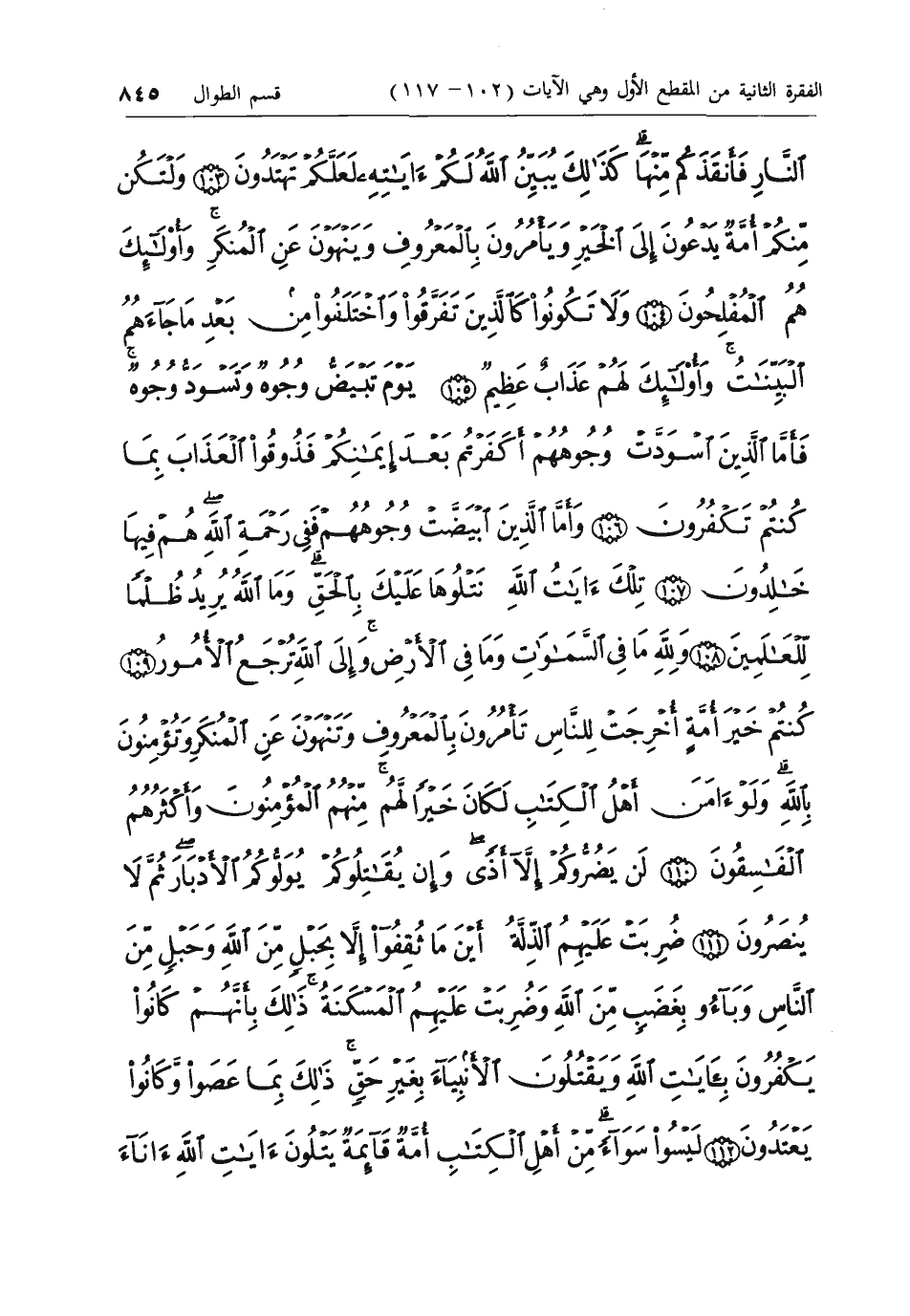 تِلْكَ آياتُ اللَّهِ نَتْلُوها عَلَيْكَ بِالْحَقِّ وَمَا اللَّهُ يُرِيدُ ظُلْماً لِلْعالَمِينَ (108) وَلِلَّهِ ما فِي السَّماواتِ وَما فِي الْأَرْضِ وَإِلَى اللَّهِ تُرْجَعُ الْأُمُورُ (109) كُنْتُمْ خَيْرَ أُمَّةٍ أُخْرِجَتْ لِلنَّاسِ تَأْمُرُونَ بِالْمَعْرُوفِ وَتَنْهَوْنَ عَنِ الْمُنْكَرِ وَتُؤْمِنُونَ بِاللَّهِ وَلَوْ آمَنَ أَهْلُ الْكِتابِ لَكانَ خَيْراً لَهُمْ مِنْهُمُ الْمُؤْمِنُونَ وَأَكْثَرُهُمُ الْفاسِقُونَ (110) لَنْ يَضُرُّوكُمْ إِلاَّ أَذىً وَإِنْ يُقاتِلُوكُمْ يُوَلُّوكُمُ الْأَدْبارَ ثُمَّ لا يُنْصَرُونَ (111) ضُرِبَتْ عَلَيْهِمُ الذِّلَّةُ أَيْنَ ما ثُقِفُوا إِلاَّ بِحَبْلٍ مِنَ اللَّهِ وَحَبْلٍ مِنَ النَّاسِ وَباؤُ بِغَضَبٍ مِنَ اللَّهِ وَضُرِبَتْ عَلَيْهِمُ الْمَسْكَنَةُ ذلِكَ بِأَنَّهُمْ كانُوا يَكْفُرُونَ بِآياتِ اللَّهِ وَيَقْتُلُونَ الْأَنْبِياءَ بِغَيْرِ حَقٍّ ذلِكَ بِما عَصَوْا وَكانُوا يَعْتَدُونَ (112)