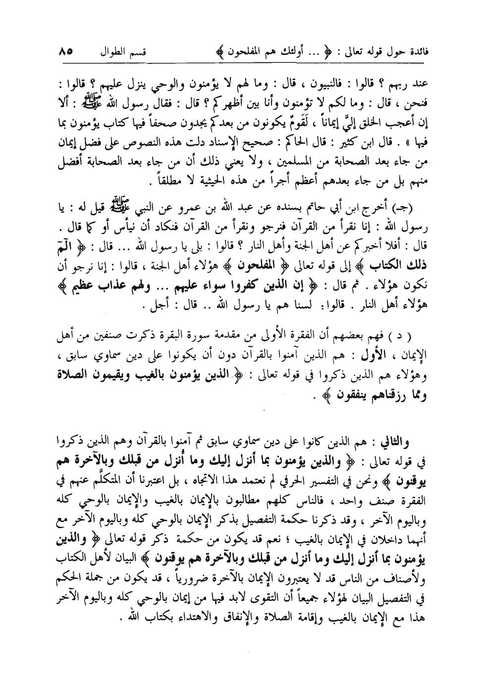 ونحن في التفسير الحرفي لم نعتمد هذا الاتجاه، بل اعتبرنا أن المتكلم عنهم في الفقرة صنف واحد، فالناس كلهم مطالبون بالإيمان بالغيب والإيمان بالوحي كله وباليوم الآخر، وقد ذكرنا حكمة التفصيل بذكر الإيمان بالوحي كله وباليوم الآخر مع أنهما داخلان في الإيمان بالغيب؛ نعم قد يكون من حكمة ذكر قوله تعالى وَالَّذِينَ يُؤْمِنُونَ بِما أُنْزِلَ إِلَيْكَ وَما أُنْزِلَ مِنْ قَبْلِكَ وَبِالْآخِرَةِ هُمْ يُوقِنُونَ البيان لأهل الكتاب ولأصناف من الناس قد لا يعتبرون الإيمان بالآخرة ضروريا، قد يكون من جملة الحكم في التفصيل البيان لهؤلاء جميعا أن التقوى لا بد فيها من إيمان بالوحي كله وباليوم الآخر هذا مع الإيمان بالغيب وإقامة الصلاة والإنفاق والاهتداء بكتاب الله.